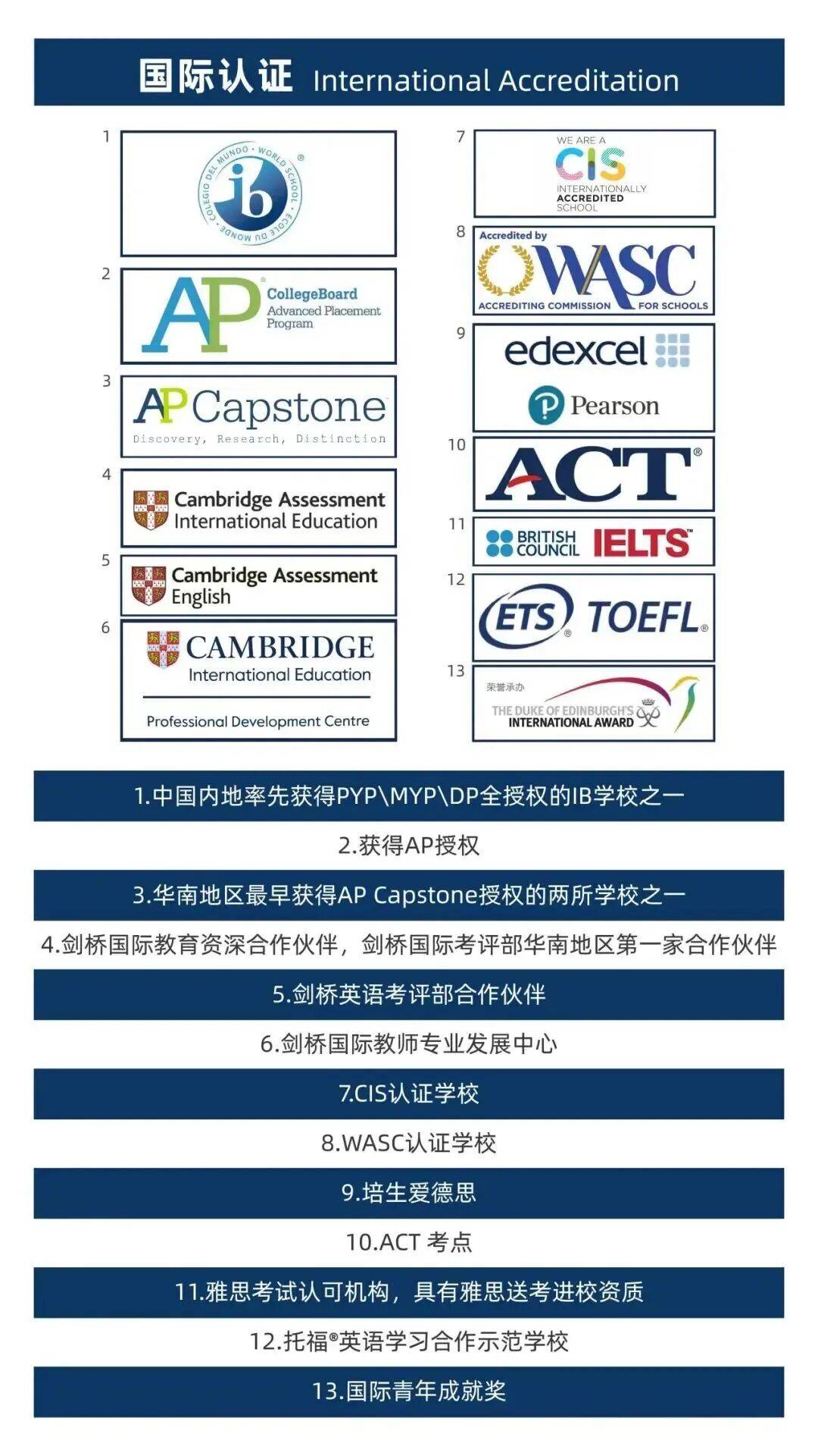 学校实施IBPYP/MYP/DP、IG/AL、AP六大国际项目,是中国最早的全学段IB世界学校之一,是华南地区第一家剑桥合作伙伴,是华南地区最早获得AP Capstone授权的两所学校之一。学校已获得十三项国际认证或授权,包括被誉为国际学校评估领域“奥斯卡”的CIS和WASC。