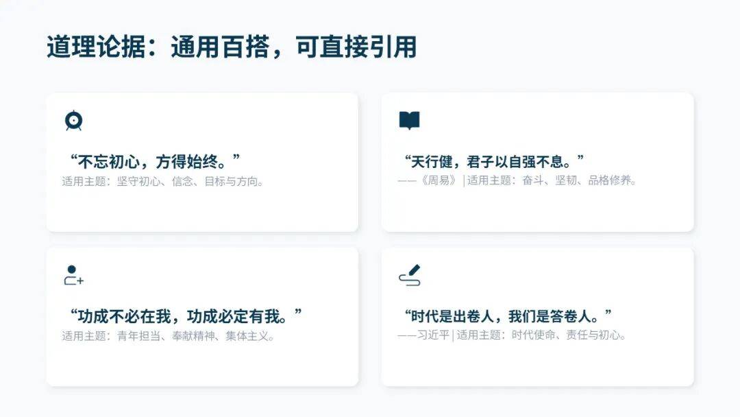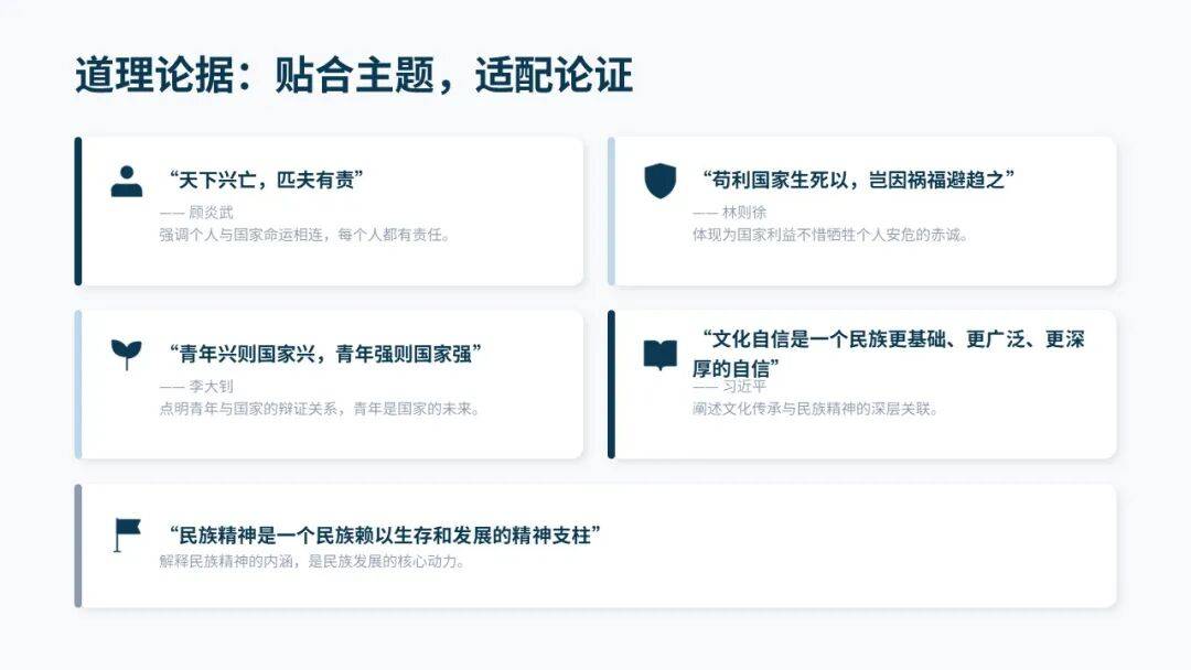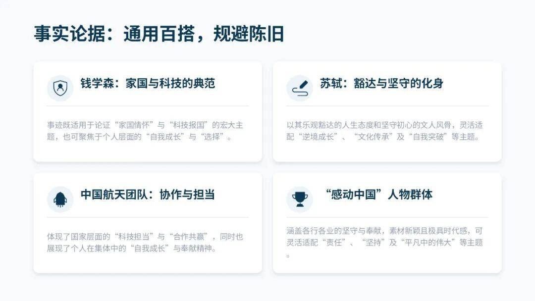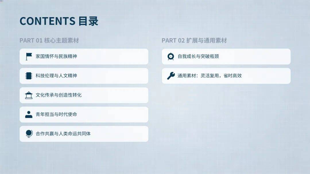 引语类材料(“故事的力量”),核心主题“故事对个人成长、民族凝聚的重要作用”,审题核心“个人故事与民族故事的关联,故事的精神价值”;新课标Ⅱ卷:引语类材料(“青年与时代的双向互动”),核心主题“青年是时代的参与者,时代是青年的舞台”,审题核心“时代与青年的相互成就,青年在时代中实现自我价值”;全国乙卷:引语类材料(“吹灭别人的灯/一花独放不是春”),核心主题“合作共赢,共同发展”,审题核心“个人/企业/国家间的互利共赢,践行人类命运共同体理念”。