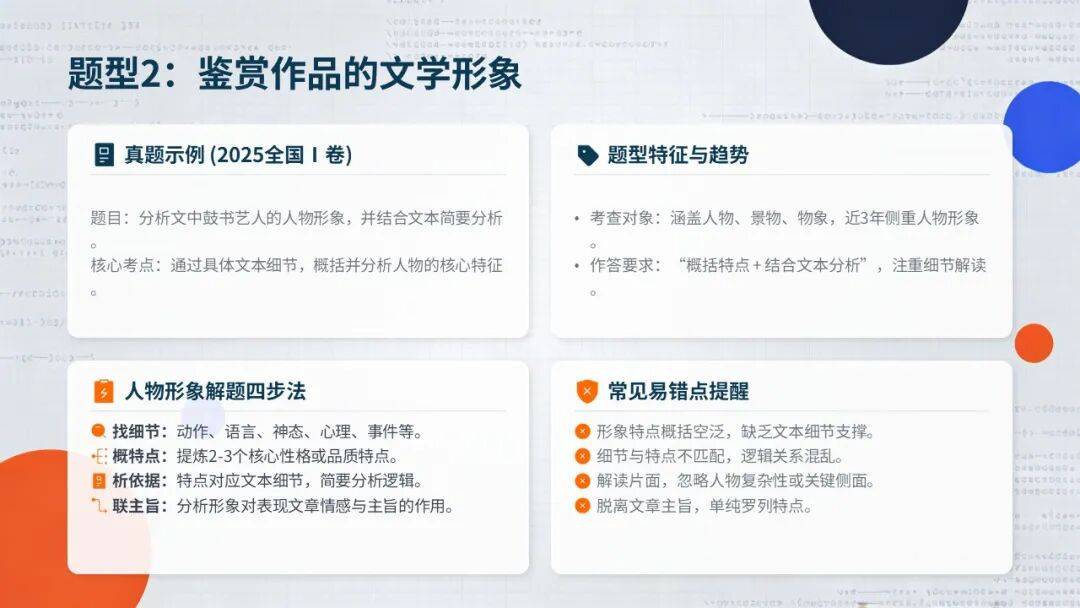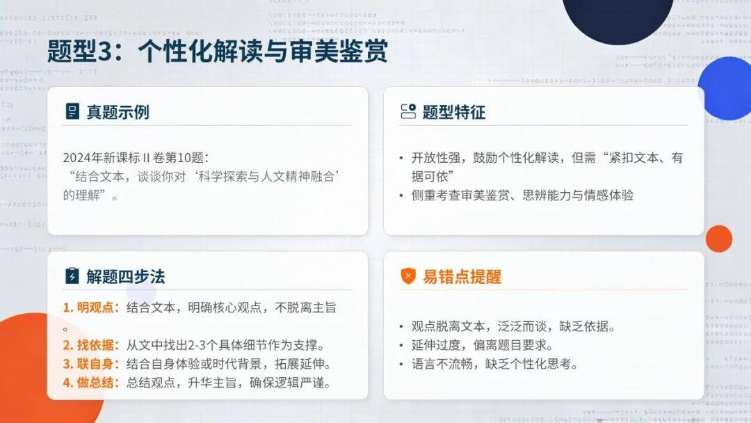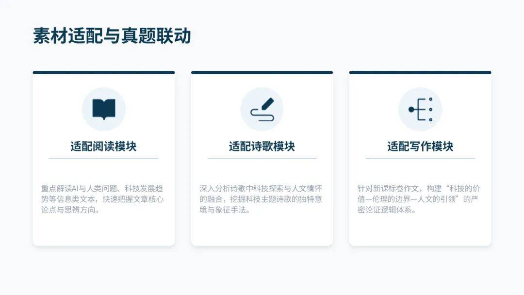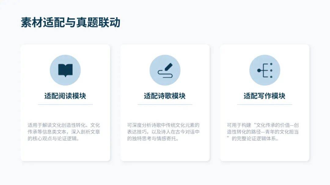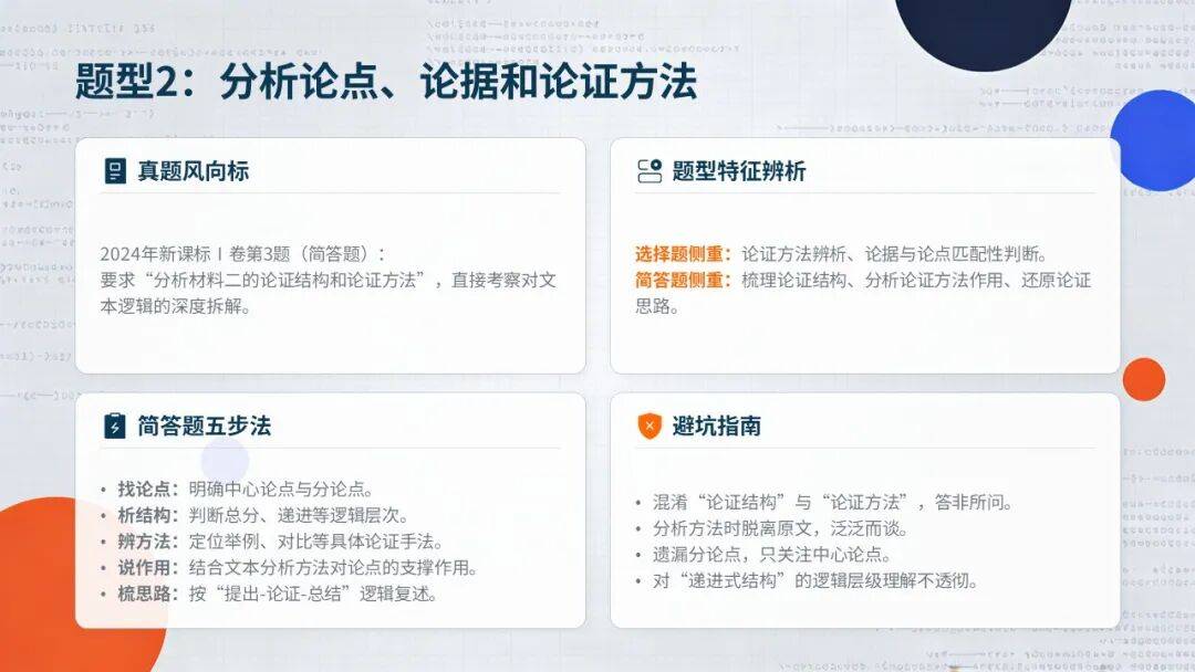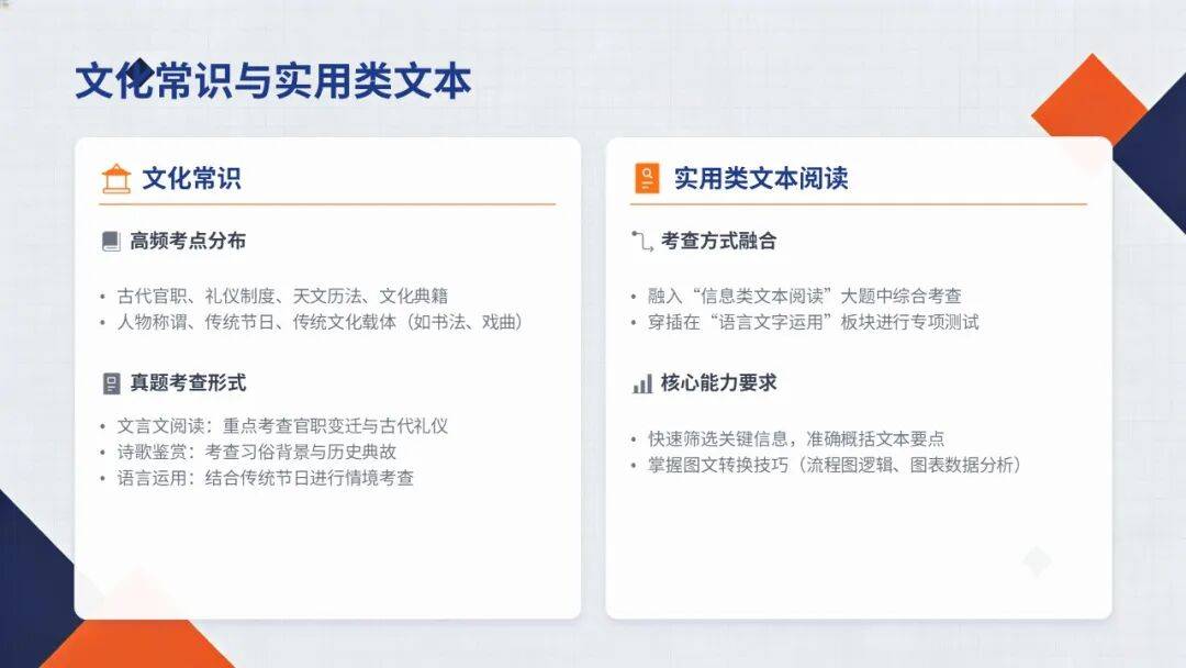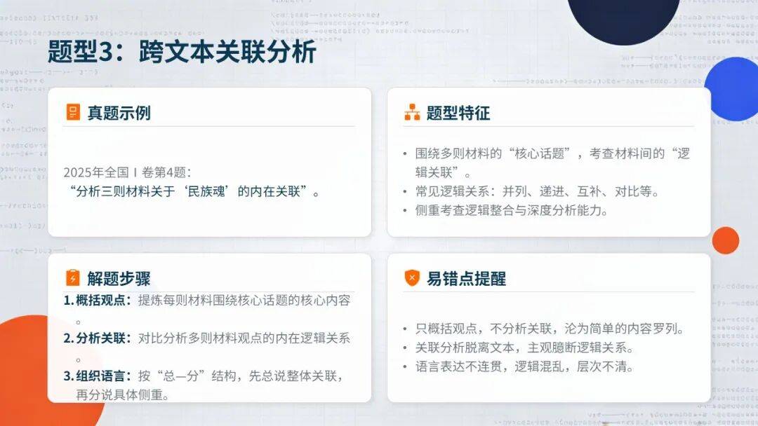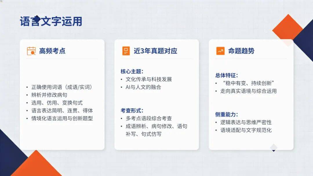 文本选材侧重“文化传承、科技伦理、时代热点、学术前沿”(如2025年民族精神、2024年AI与人类问题、2023年文化转化),多采用“2-3则文本组合”形式;设问反套路化,弱化模板依赖,强化逻辑思辨能力考查,跨文本分析成为高频难点。