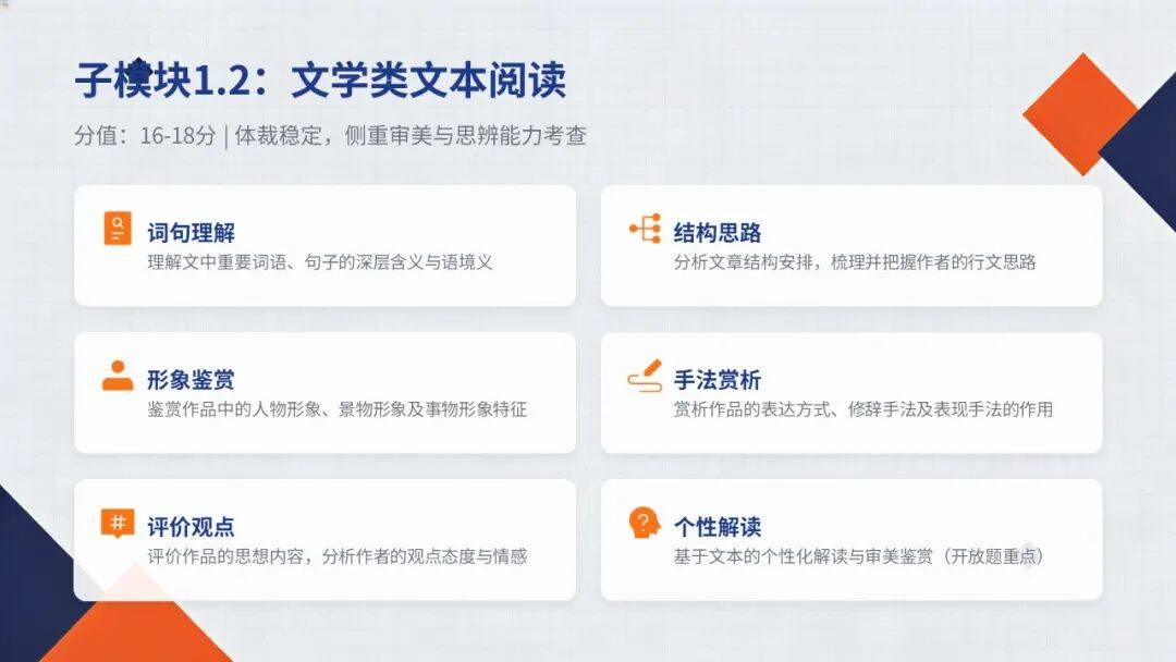 子模块1.2:文学类文本阅读(16-18分,体裁稳定,侧重审美与思辨)