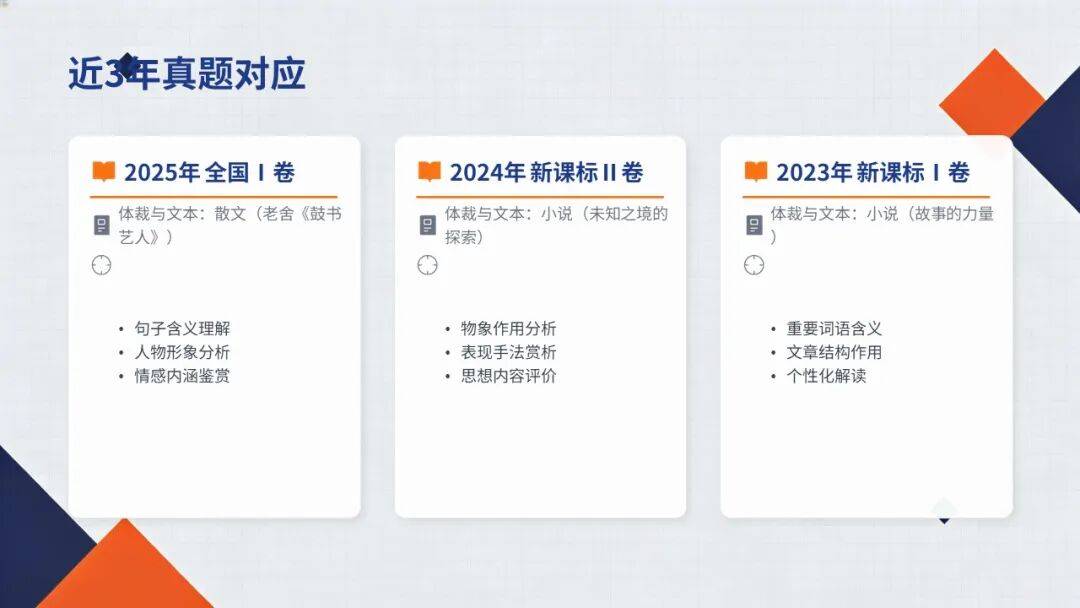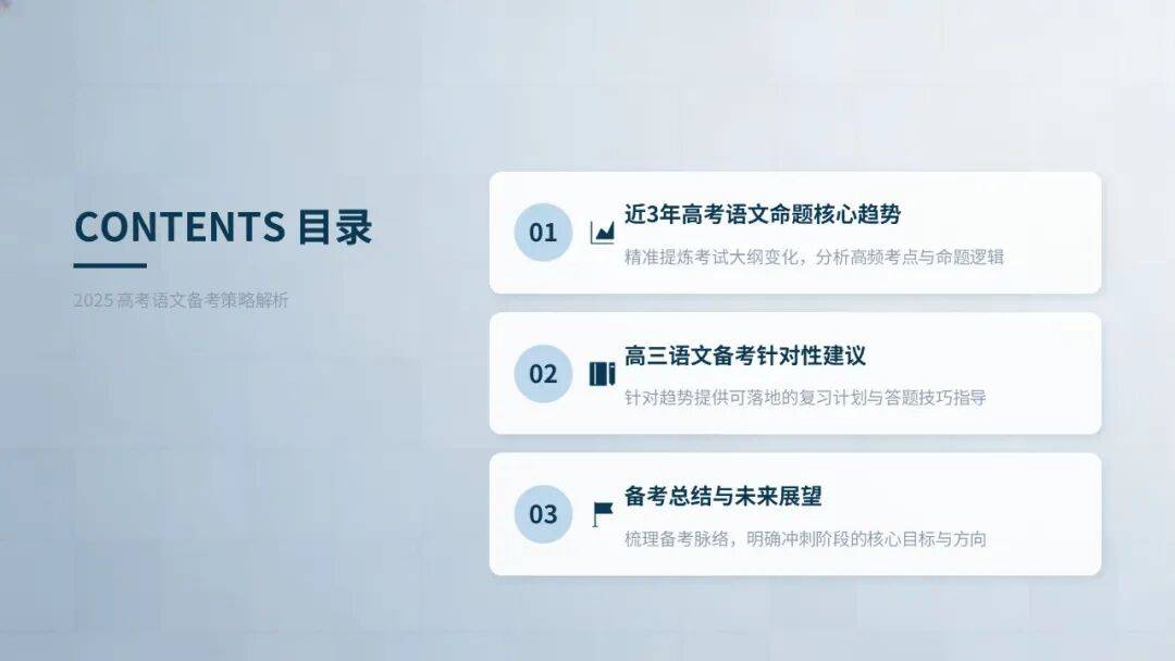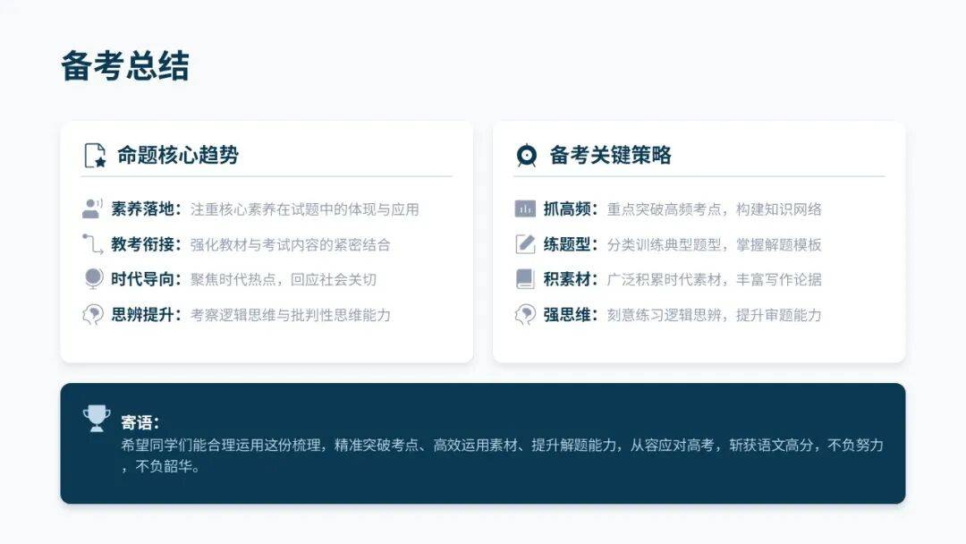 核心:结合2023、2024、2025年高考语文全国卷、新课标卷真题,总结命题核心趋势,给出针对性备考建议,覆盖“考点突破、题型训练、素材运用、心态调整”,助力高三学生高效备考,精准提分,完成整个梳理的收尾,无需再补充其他内容。
