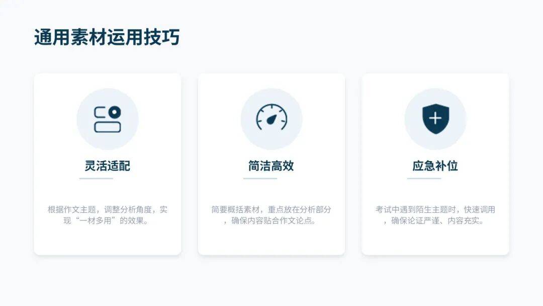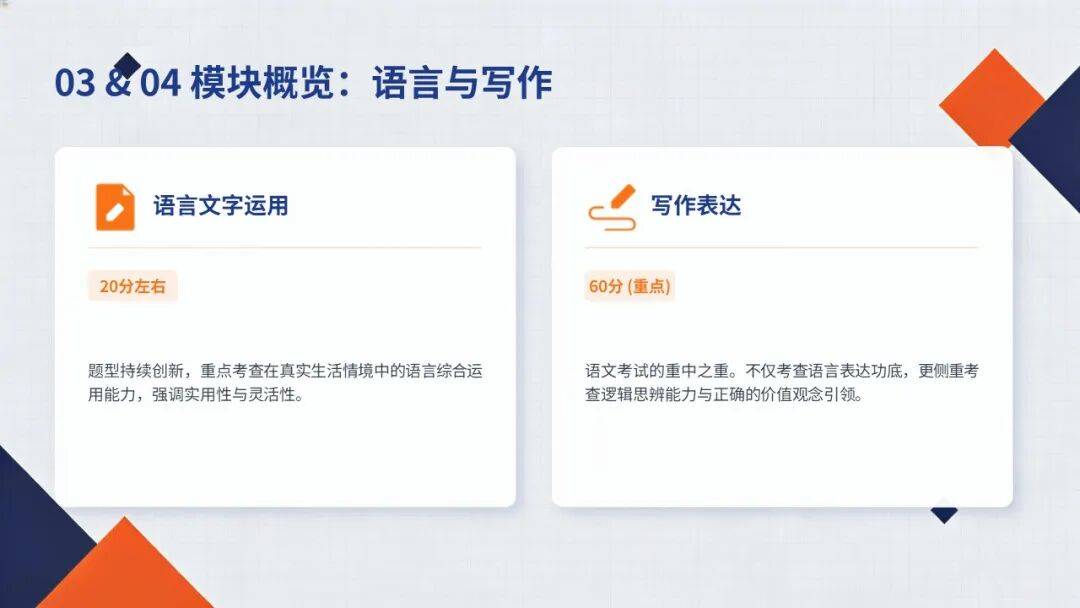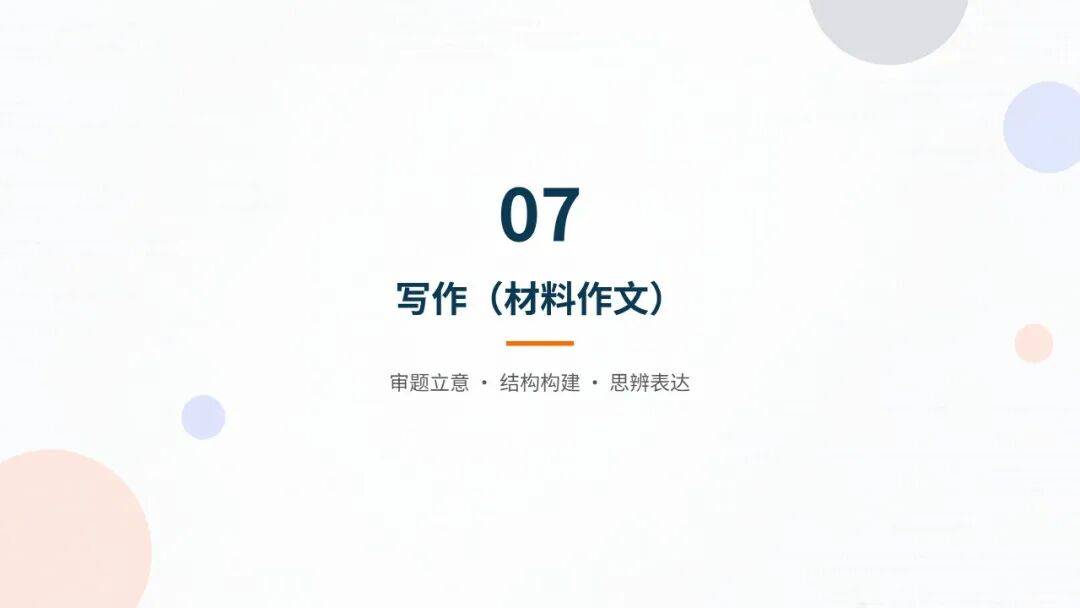 1. 材料作文(引语类、多材料组合类,近3年唯一题型);2. 审题立意(精准把握材料核心,避免偏题、跑题);