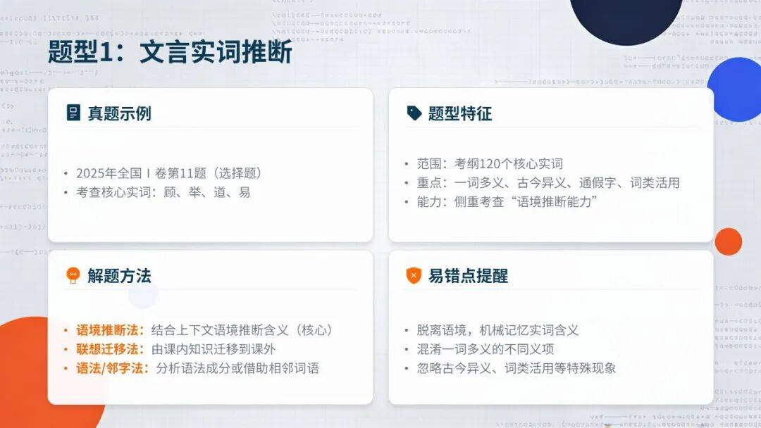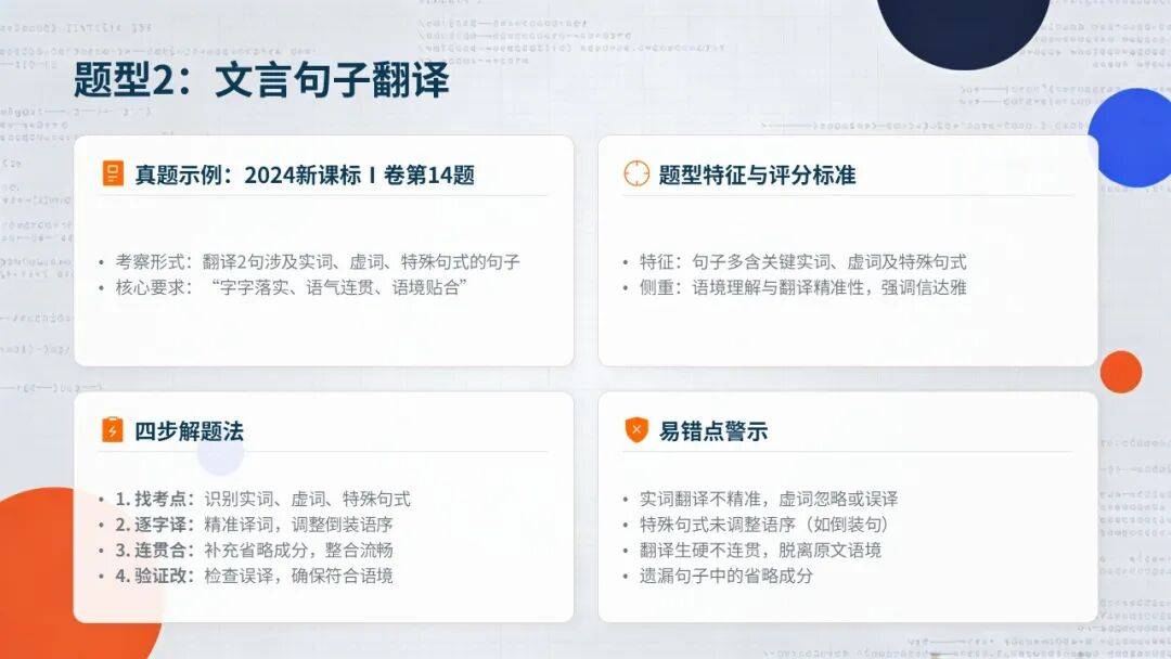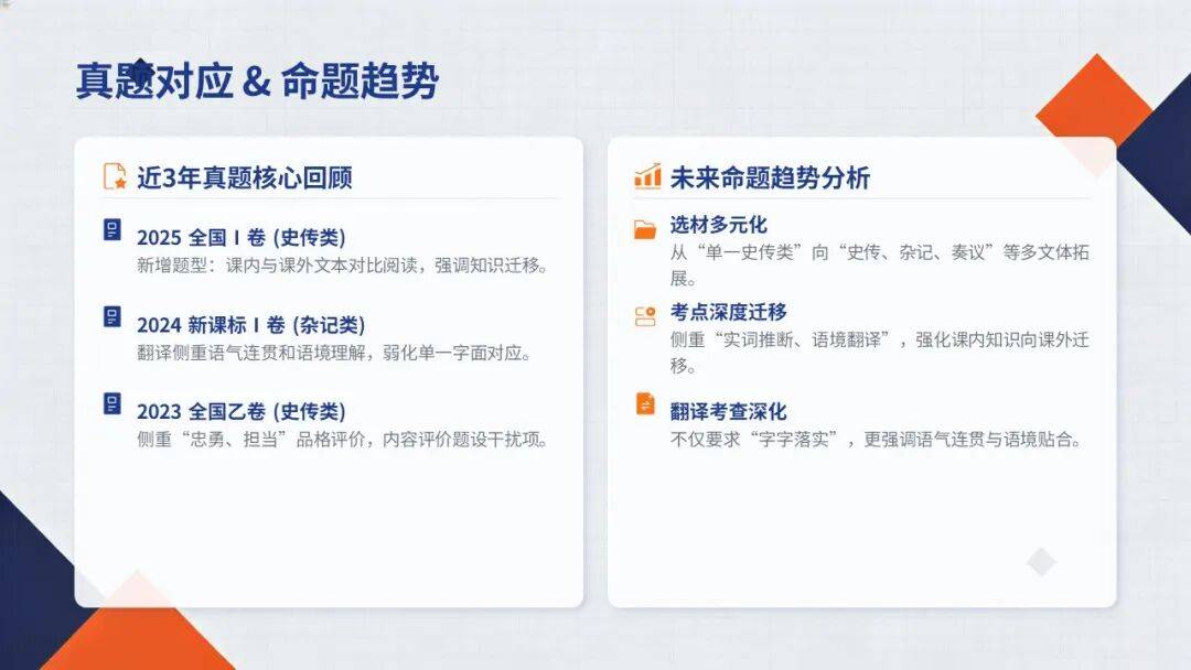 选材从“单一史传类”向“史传、杂记、奏议”多元拓展,阅读量逐年小幅增加;考点侧重“实词推断、语境翻译、课内迁移”,弱化单纯虚词记忆,强化“以文解文”能力;翻译题分值稳定(10分),侧重“字字落实、语气连贯、语境贴合”,拒绝“死译、硬译”。