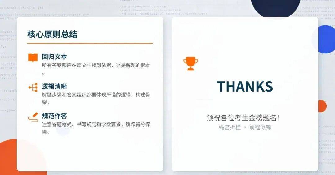 1. 规范答题格式:按照本梳理中“题型拆解”的解题步骤,规范答题语言与格式,如阅读简答题采用“要点+文本分析”的形式,作文采用“总分总”结构,分论点清晰、论据充分;2. 限时训练:模拟高考时间,定期进行整套试卷限时训练,提升答题速度与效率,适应高考节奏,避免考试中出现“时间不够、答题仓促”的问题;3. 复盘总结:每次训练后,不仅要核对答案,还要分析“错题原因、答题思路偏差、时间分配不合理”等问题,优化答题策略,提升解题准确率。