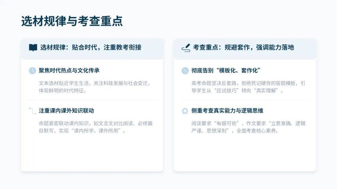 1. 选材贴合时代:文本选材聚焦“时代热点、文化传承、科技发展、学术前沿”,如2025年选材围绕民族精神、科技发展,2024年围绕AI与人文、科学探索,2023年围绕文化转化、合作共赢,选材鲜活,贴近学生生活与时代发展,引导学生关注社会、关注时代;2. 教考衔接紧密:命题注重联动课内知识,如2025年文言文考查课内与课外对比,名句默写聚焦必修+选择性必修篇目,阅读文本选材与课内论述类、文学类文本教学重点呼应,引导学生重视课内学习,实现“课内所学,课外所用”。