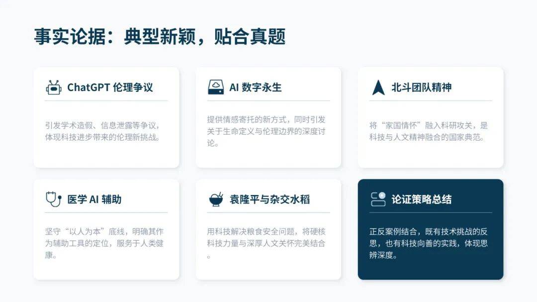 引语类材料(“互联网与AI,问题是否减少”),核心主题“科技进步与人类问题的辩证关系”,审题核心“辩证看待科技的利与弊,强调人类思考与创造的核心价值”;新课标Ⅱ卷:引语类材料(“未知之境”),核心主题“科学探索与人文精神的融合”,审题核心“科学探索需要人文精神指引,人文精神在探索中升华”;全国甲卷:引语类材料(“坦诚交流与避免冲突”),核心主题“有效沟通是化解矛盾的关键”,审题核心“坦诚交流的重要性与艺术,平衡冲突规避与问题解决”。