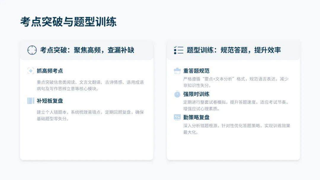 1. 抓高频考点:重点突破“现代文阅读(信息类筛选、论证分析、跨文本关联;文学类人物形象、句子含义、开放题)、文言文(实词推断、句子翻译、课内迁移)、古诗(炼字、情感、表达技巧)、语言文字运用(成语、病句、连贯)、写作(思辨性立意、论据运用)”等高频考点,每天分配固定时间,专项训练,提升解题能力;2. 查漏补缺:结合自身答题情况,梳理易错点(如文言文翻译的特殊句式、成语的近义辨析、作文的审题偏差),建立错题本,定期复盘,避免重复犯错;3. 强化基础:名句默写、文言实词、虚词、文化常识等基础考点,每天坚持积累,确保基础分不丢失,重点关注2024、2025年新增的情境化默写、图画配诗等题型,针对性训练。