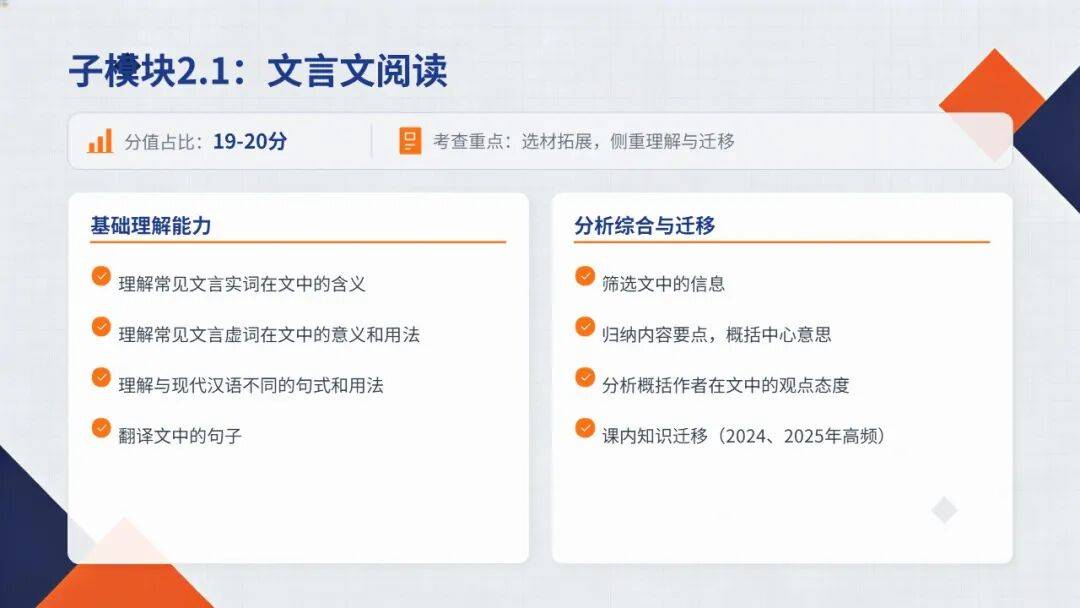 子模块2.1:文言文阅读(19-20分,选材拓展,侧重理解与迁移)