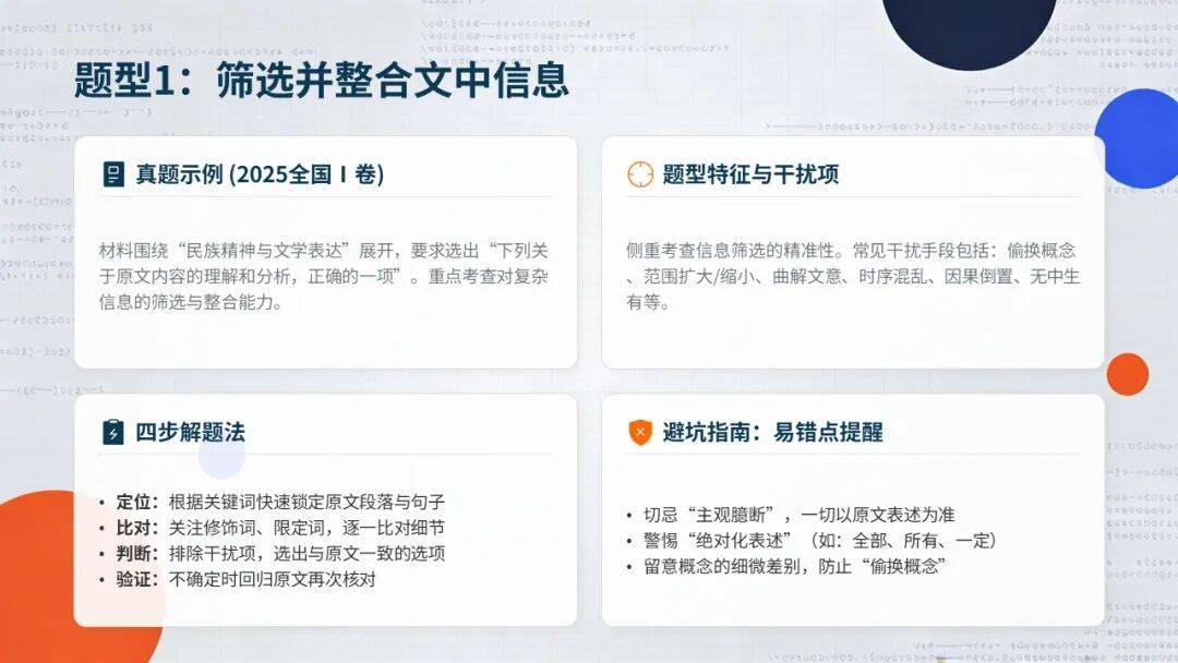 多文本聚焦“文化创造性转化”,考查“筛选整合信息”“概括内容要点”“推断作者观点”,其中“推断题”设置干扰项(偷换概念、范围扩大),侧重考查逻辑严谨性,与2024、2025年命题逻辑一致。