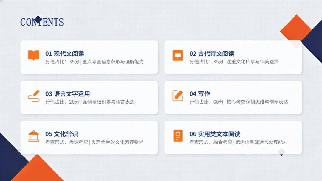 1. 稳定题型:现代文阅读(信息类、文学类)、古代诗文阅读(文言文、古诗、默写)、语言文字运用、写作,四大核心模块题型稳定,分值波动小,确保备考的针对性;2. 创新趋势:题型持续创新,如2025年新增“图画配诗默写”“错别字改正”“成语用法演变分析”,2024年新增“跨文本关联分析”“语境化病句修改”,所有创新题型均围绕“情境化、综合化”展开,拒绝机械答题,强调语言的实际运用能力;3. 思辨性提升:无论是阅读题的设问,还是作文的主题,均强化辩证思维考查,如“科技与人文”“坚守与创新”“个人与时代”等二元/多元辩证话题成为高频,要求学生具备全面、深刻的思维能力,拒绝片面化、口号化表达。