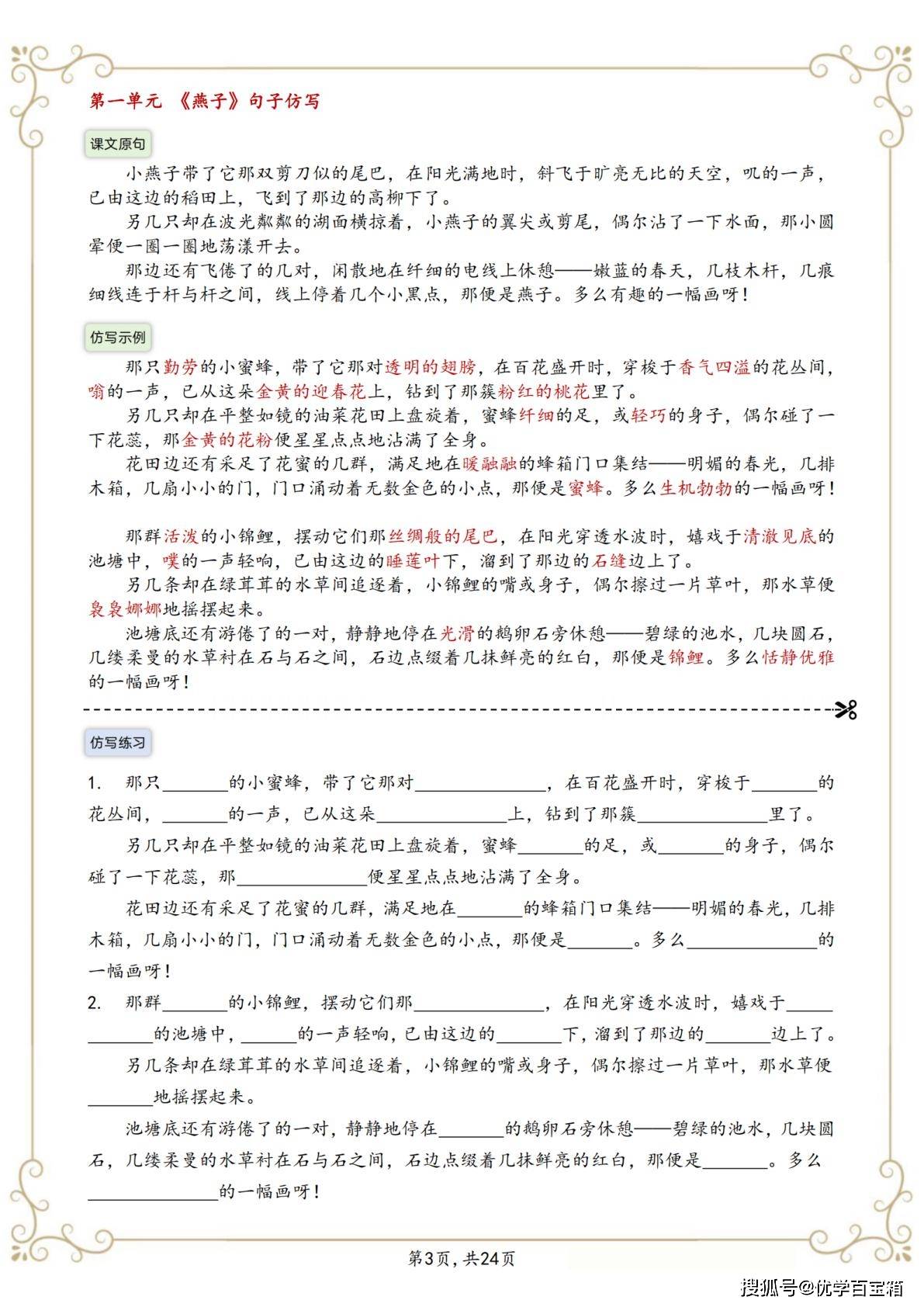 在呈现形式上,资料采用了科学的分层训练模式,让仿写学习有章可循。每一个仿写主题都先列出课文原句,提炼核心写作要领,比如《燕子》外形仿写强调 “局部拆解 + 比喻修辞 + 固定句式”,《荷花》仿写明确 “整体勾勒 + 有序分类” 的方法。同时搭配多篇贴合生活的仿写示例,再设计阶梯式的填空练习,从模仿词语到补充句子,降低了仿写难度,让学生能快速掌握技巧,实现从 “读懂” 到 “会写” 的转变。