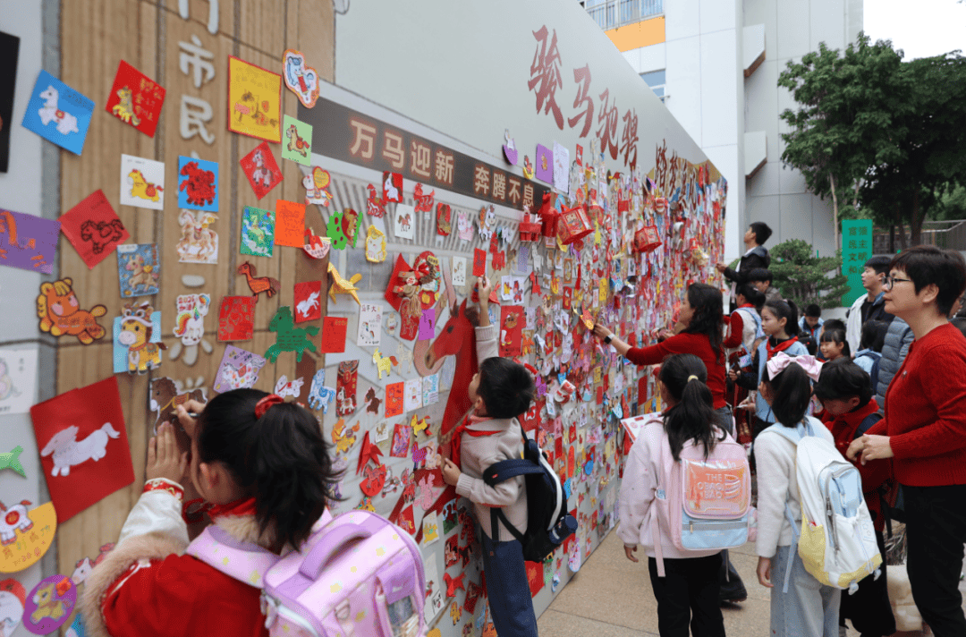 2月25日上午,厦门市民立第二小学校门口热闹非凡。孩子们身着喜庆服饰,手持自制的“心愿小马”有序入校——加油马、追梦马、赤兔马……造型各异、色彩缤纷。每一匹小马身上都写着新学期奋斗目标。在老师引导下,孩子们将小马粘贴到“万马奔腾”主题墙上,千匹小马汇聚成震撼的校园风景线,以满满的创意与期待开启马年新征程。