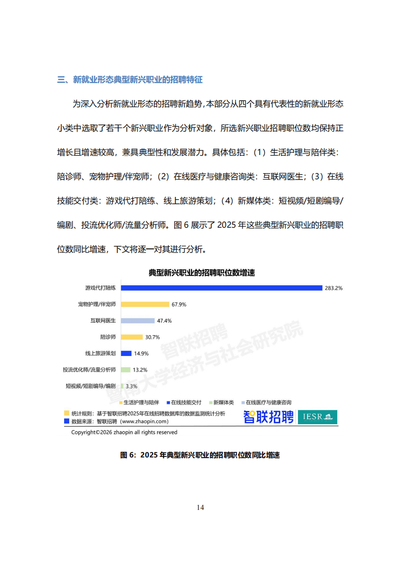 多个典型新兴职业需求增长显著,游戏代打陪练职位数增速达283.2%,宠物护理/伴宠师、互联网医生增速也近70%和50%,这类岗位因行业发展需求呈现不同的准入特征,如陪诊师门槛“双低”、互联网医生学历刚性经验弹性、宠物护理师重实操经验。而短视频/短剧编导等新媒体岗位则对学历和经验均有较高要求。