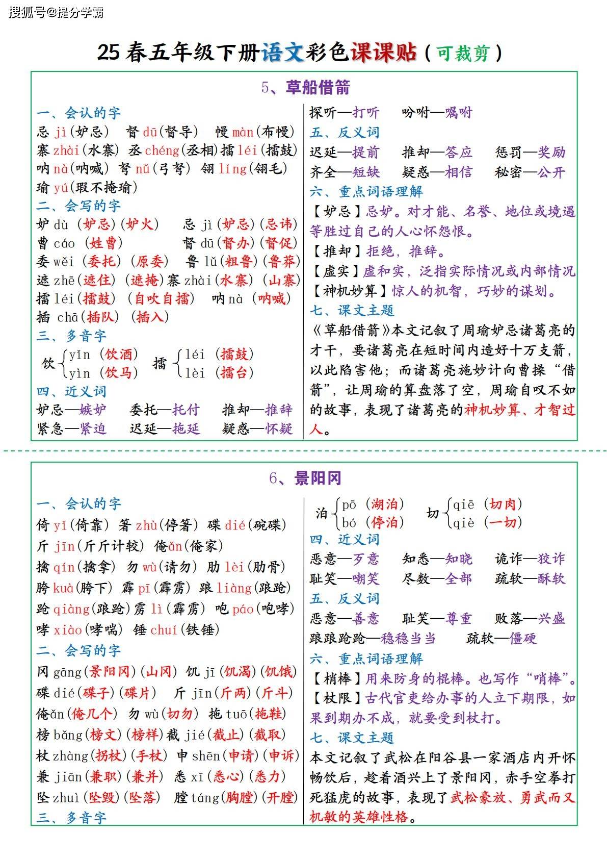 值得一提的是,这份课课贴的 “可裁剪” 设计十分贴心,孩子可以将每课的知识点剪下来,贴在课本对应位置,课堂上跟着老师的节奏标注,复习时也能快速翻阅核心考点。它摒弃了复杂的讲解,直击考试重点,既适合孩子寒假自主预习,梳理课文脉络,也适合开学后课堂使用,查漏补缺。整体而言,这份课课贴是五年级下册语文学习的高效辅助资料。它将零散的知识点系统化、条理化,降低了孩子的学习难度,让预习更有方向,复习更有重点。有了这份资料,孩子能轻松吃透前八课的核心内容,为整个学期的语文学习打下坚实基础。