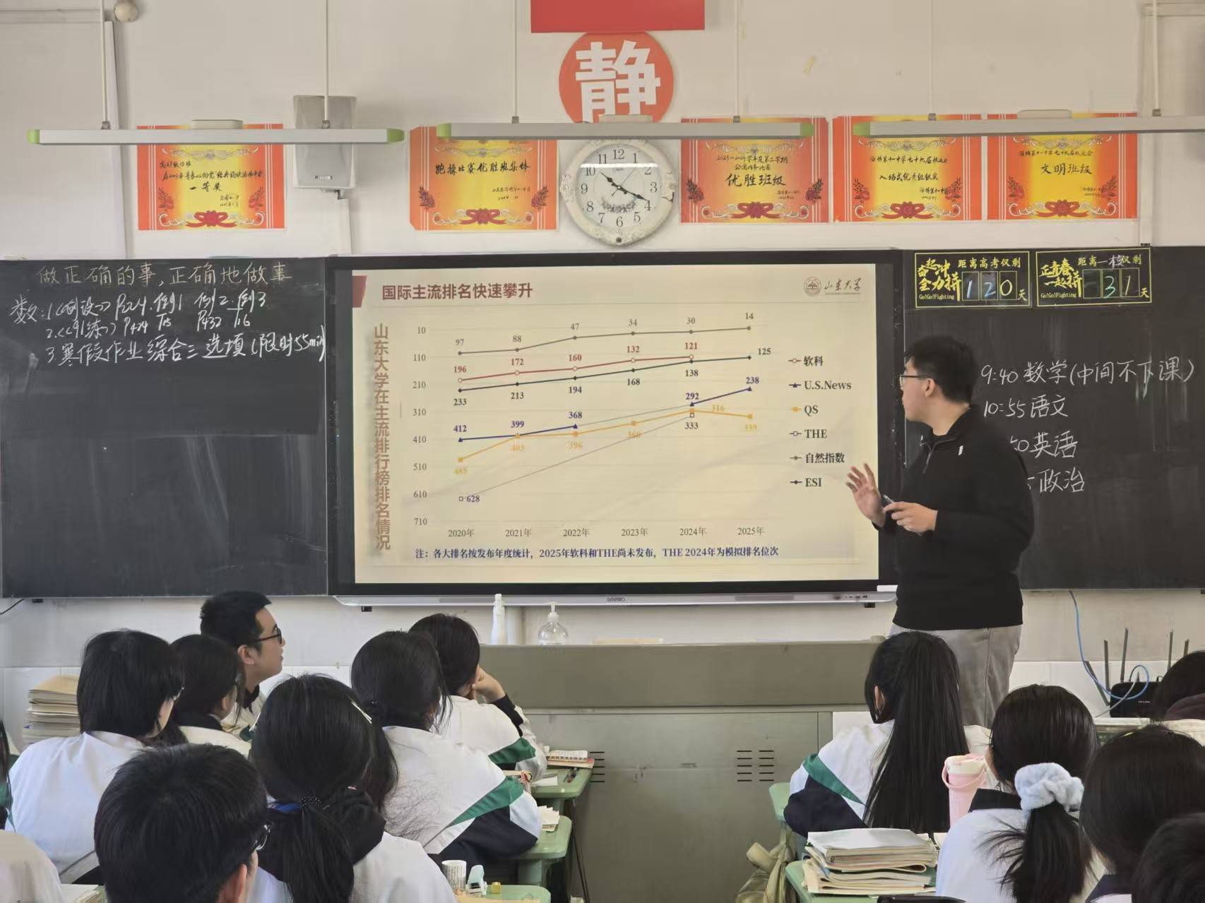 随后,李牧熹通过精心制作的 PPT,从办学历史、学科实力、科研成就、培养模式、校园文化等多个维度,全面而生动地展示了山东大学的深厚底蕴与独特魅力。他介绍了山东大学 “为天下储人才,为国家图富强” 的办学宗旨和 “学无止境,气有浩然” 的校训,以及学校 “一校三城”(济南、威海、青岛)的办学格局和涵盖除军事学以外所有学科门类的综合实力。他重点讲解了学校在数学、化学、临床医学等领域的顶尖学科优势,以及在自主转专业、各类特色学堂(如泰山学堂、尼山学堂)等方面为学生提供的广阔发展平台。同时,他还分享了山东大学丰富的校园文化活动、一流的教学科研设施(如图书馆、实验室、运动场)和来自天南地北的特色美食,让同学们对未来的大学生活有了更直观、更深刻的认识。