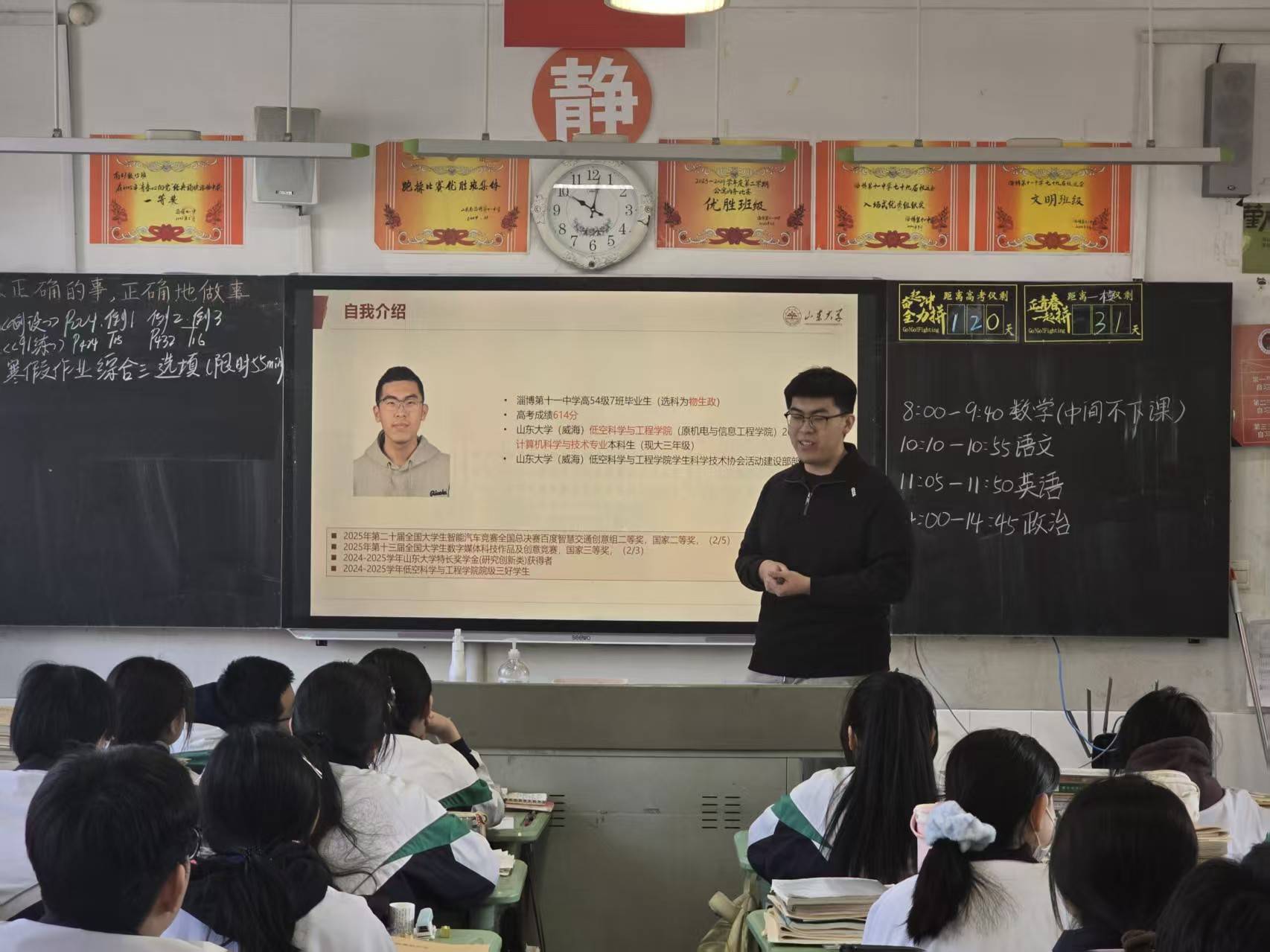 为搭建高校与高中的交流桥梁,助力母校学子明确学习方向,树立远大理想,2026 年 2 月,山东大学(威海)低空科学与工程学院 2023 级计算机科学与技术(中澳合作办学)专业本科生、淄博第十一中学高 54 级 7班优秀毕业生李牧熹,作为 “山东 478 队・薪火相传队” 成员,重返母校淄博十一中,为高 57 级 5 班、7班和15班的学弟学妹们带来了一场主题为 “青春逐梦,山大启航” 的经验分享会。本次活以 PPT 宣讲、经验分享、宣讲材料分发和互动问答的形式展开,现场气氛热烈,反响良好。
