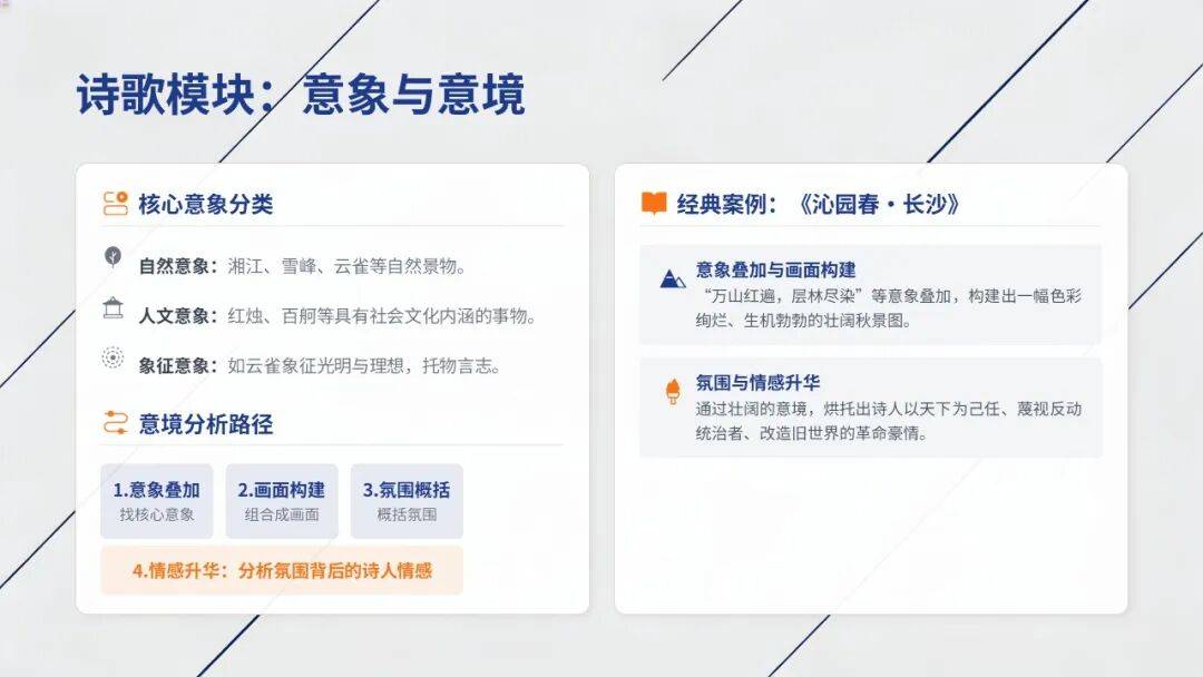 •意境分析路径:意象叠加→画面构建→氛围概括→情感升华(如《沁园春》“万山红遍”等意象构成壮阔秋景,烘托革命豪情)。