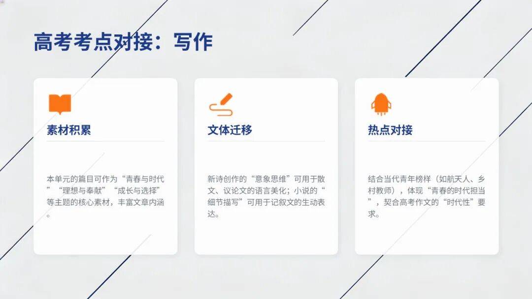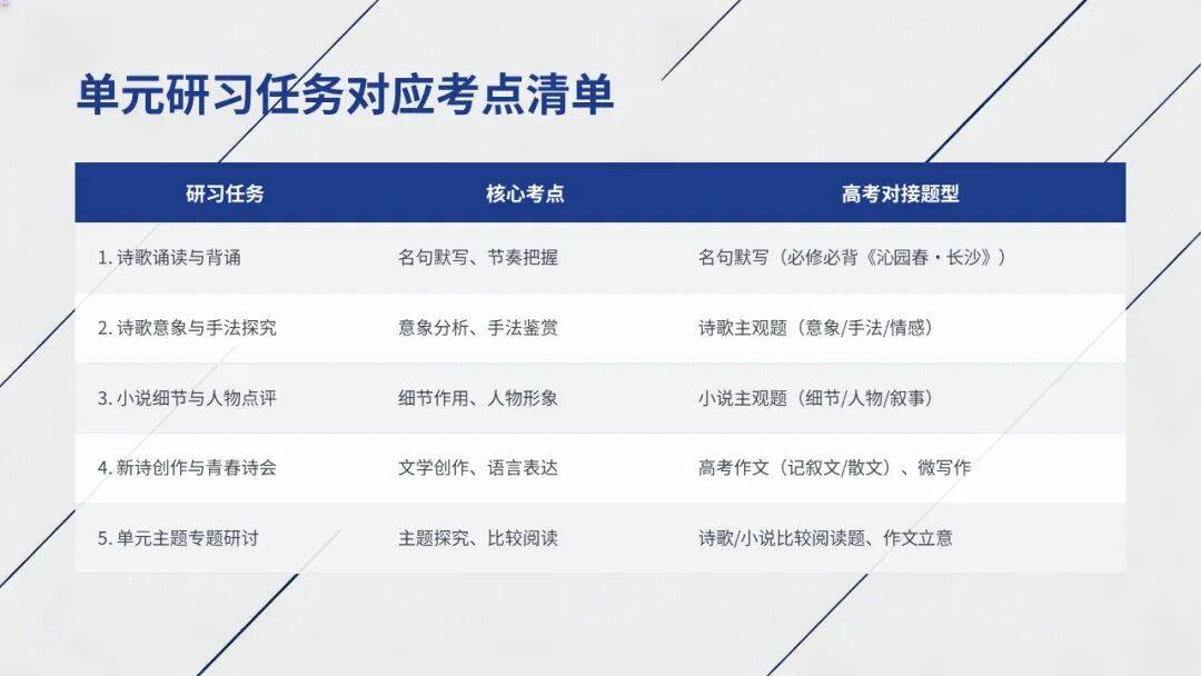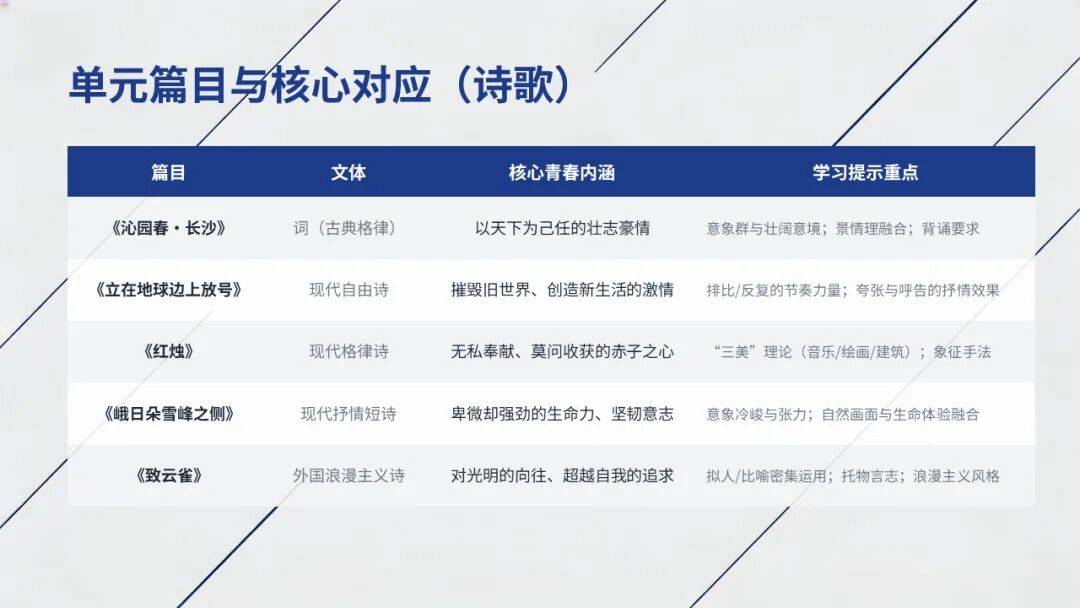 1.新诗创作:掌握意象选取、节奏营造、托物言志等技巧,主题聚焦“青春”。
