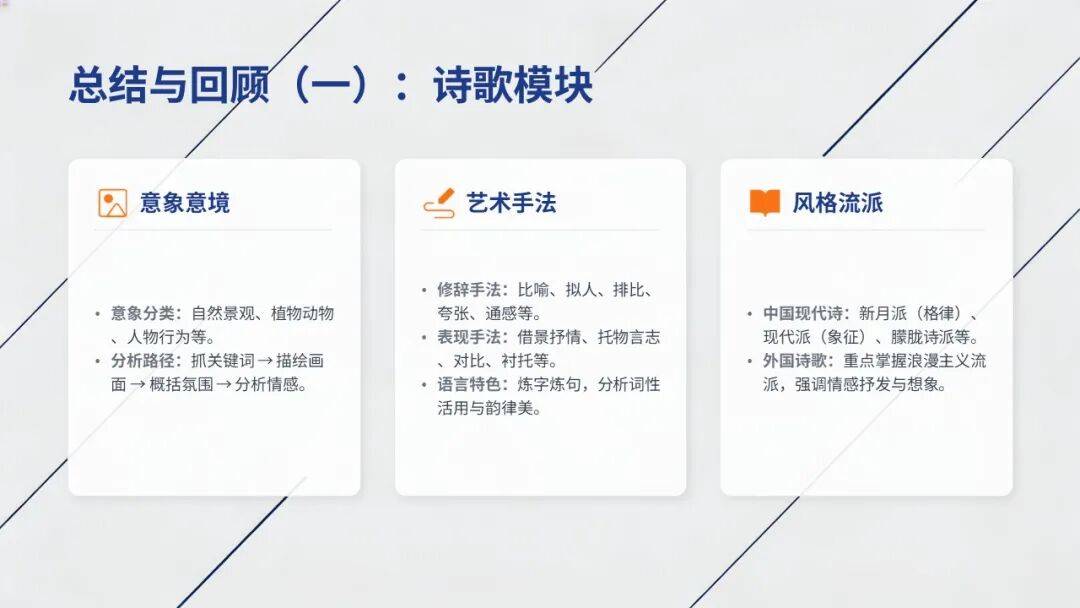 a.诗歌:抓意象、析手法、悟情感,体会韵律与风格;