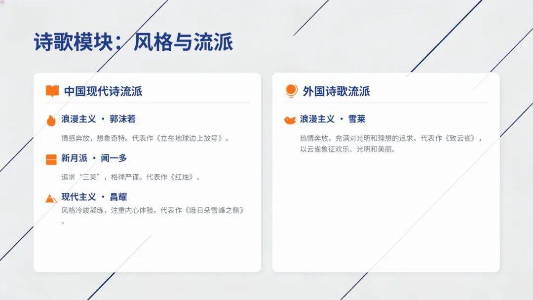 •中国现代诗:浪漫主义(郭沫若)、新月派(闻一多,“三美”)、现代主义(昌耀,冷峻凝练)。