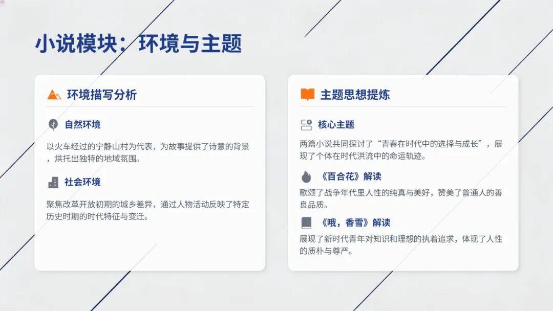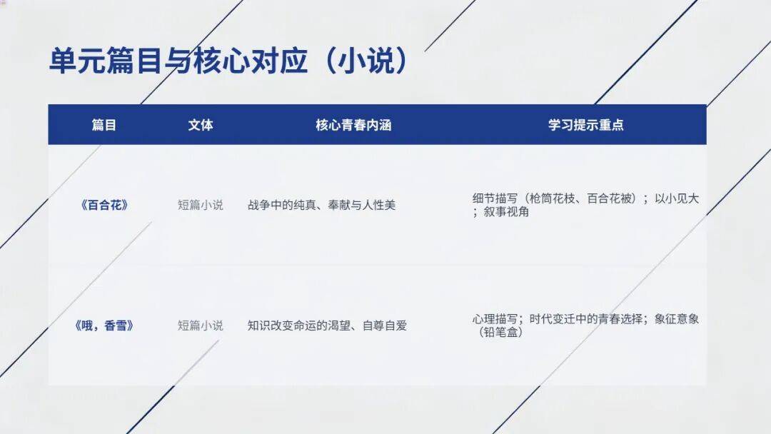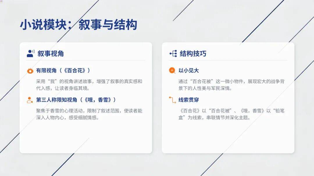 •结构技巧:以小见大(《百合花》用“被面”写战争人性);线索贯穿(《百合花》“百合花被”,《哦,香雪》“铅笔盒”)。