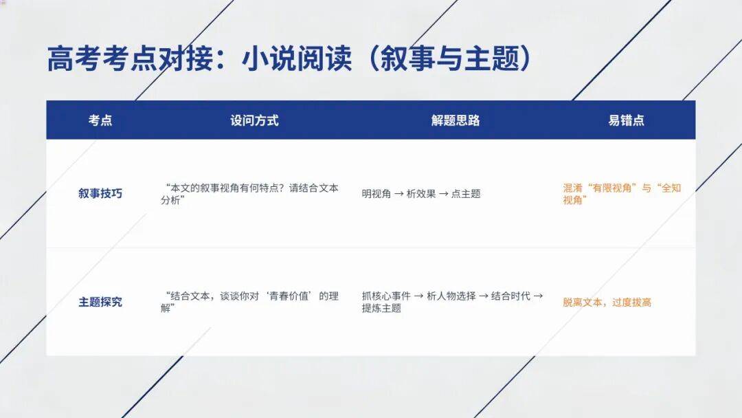 核心考点:叙事视角、关键语句含义、人物形象(对接《百合花》《哦,香雪》)
