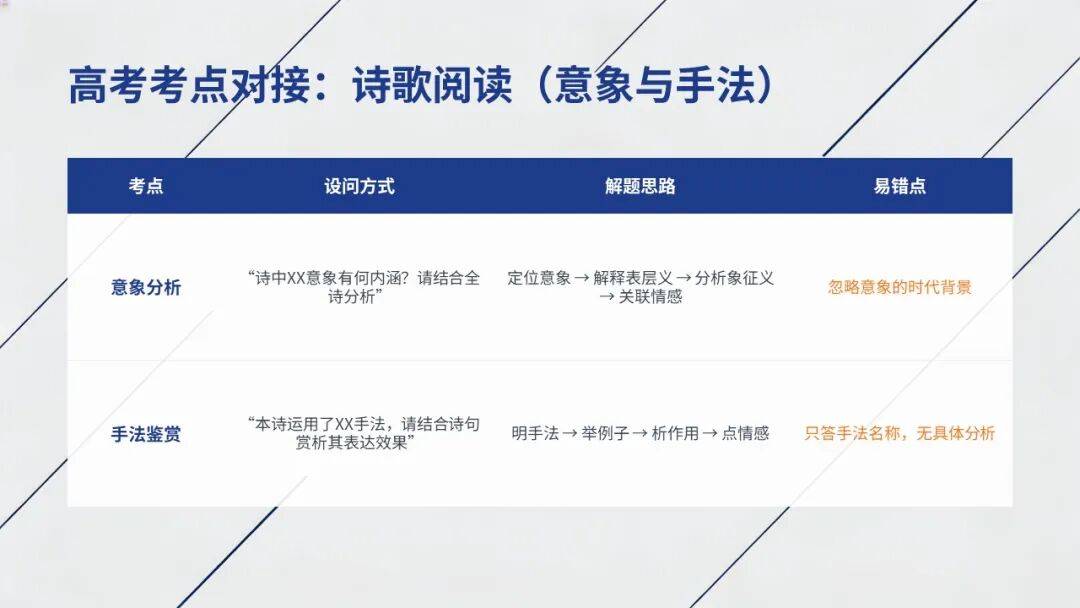 核心考点:意象与意境、表现手法、情感分析(对接《峨日朵雪峰之侧》)