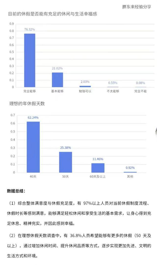 据发布数据显示,有97.55%的员工对目前每年40天的休假安排感到“非常满意”或“比较满意”;同时,约94%的员工对当前每天7小时的工作时间及安排感到满意。
