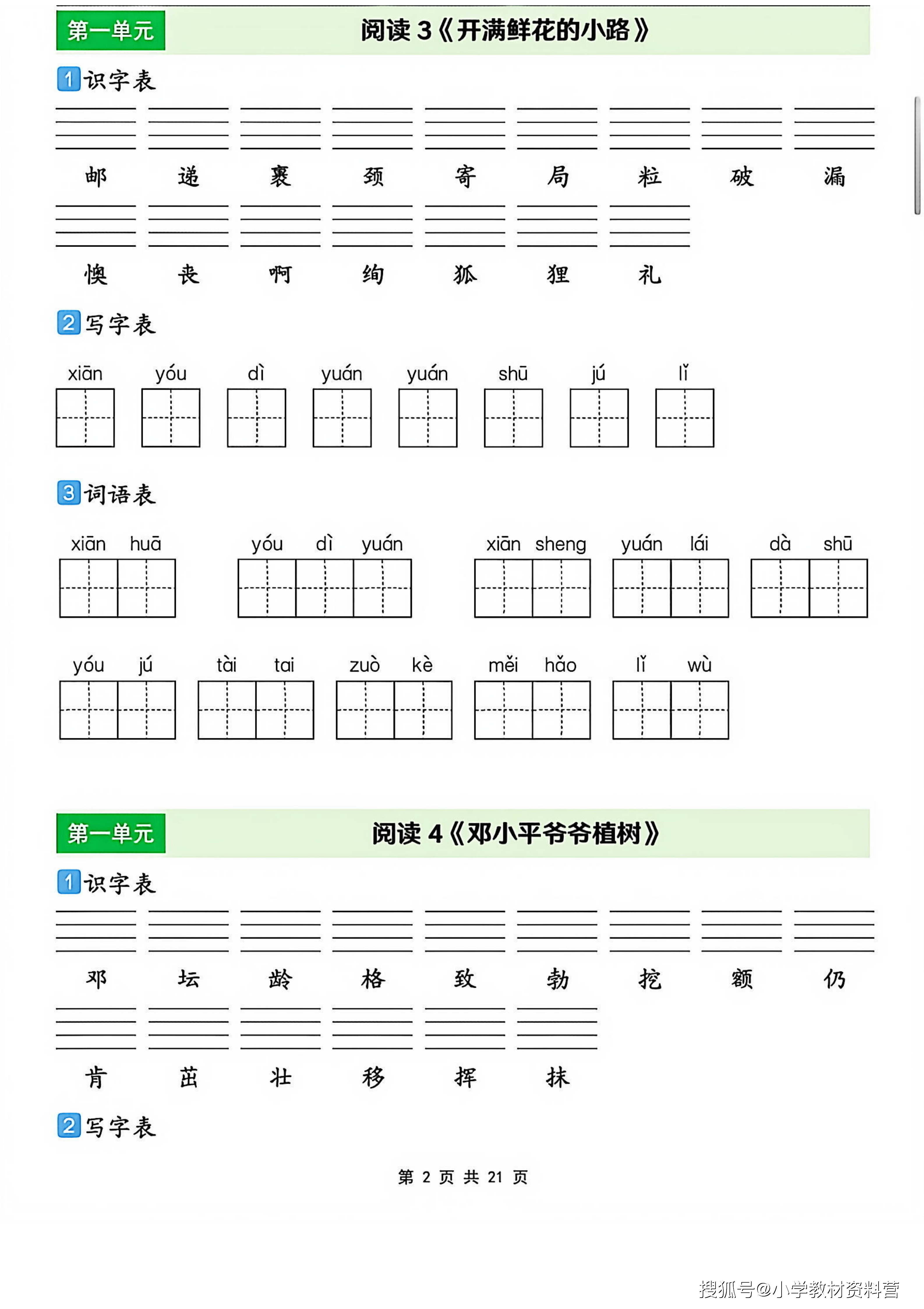 今天给大家分享:翻开二年级语文下册的第一单元,仿佛推开了一扇通往春天的门。从《古诗二首》里 “咏、荷、妆、丝” 的诗意,到《找春天》中 “脱、袄、羞、嫩” 的鲜活,再到《开满鲜花的小路》里 “邮、递、裹、绚” 的温暖,每一个汉字都像一颗种子,在孩子的心田里悄悄发芽。这些看似简单的识字表、写字表和词语表,其实是语文学习的基石,也是连接生活与想象的桥梁。