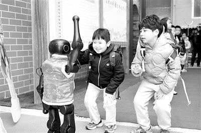 北京市东城区府学胡同小学学生与机器人打招呼。学校供图