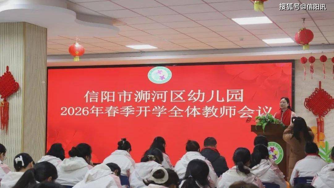 开学前夕,浉河区幼儿园召开了2026年春季开学全体教师会议。全面部署新学期各项工作任务,明确工作目标、细化责任分工,从教育教学、安全管理、卫生保健、后勤保障等方面提出具体要求,统一思想、凝聚共识,为新学期各项工作高效开展奠定坚实基础。