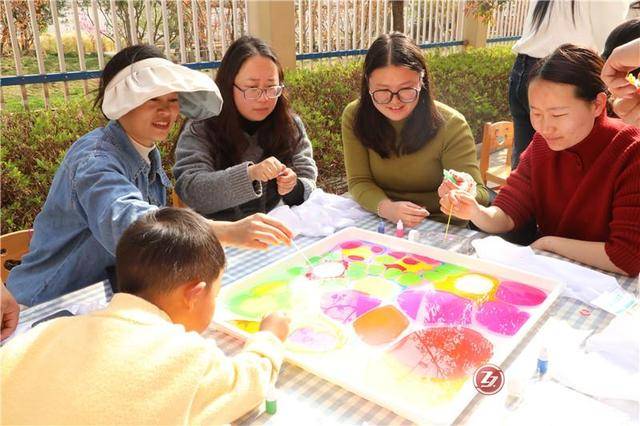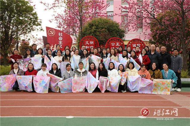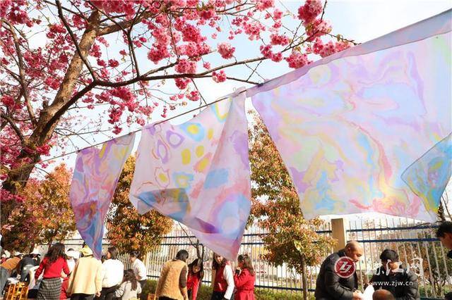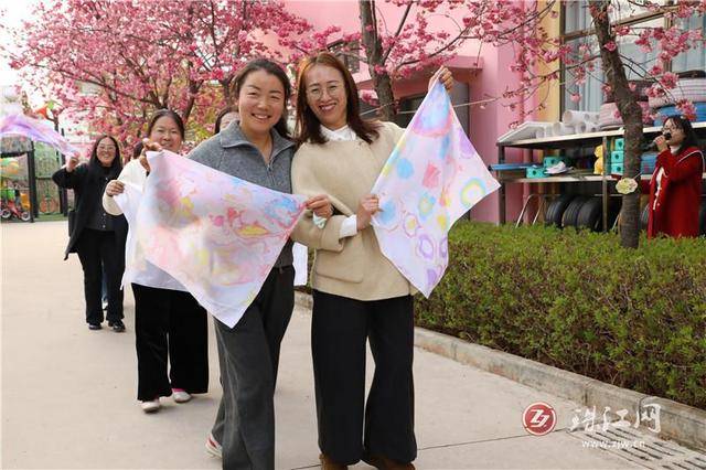 手工印染时刻,案上铺开素白丝巾,恰似未着墨的宣纸。老师们俯身挑选拓染素材,有的偏爱薄荷绿的清冽,有的钟情玫瑰红的馥郁,有人喜爱银杏的金黄,还有人独宠蔚蓝的深沉。色彩缤纷化开,汁液渗染,独特的纹理永远住进了丝纤维的缝隙里。这是春光与布帛的私语,是春天被轻轻拓染的证据。“你看,这晕开的纹理像不像羽毛?”“我的像一幅水墨画呢。”低语声里,时光漫漫。