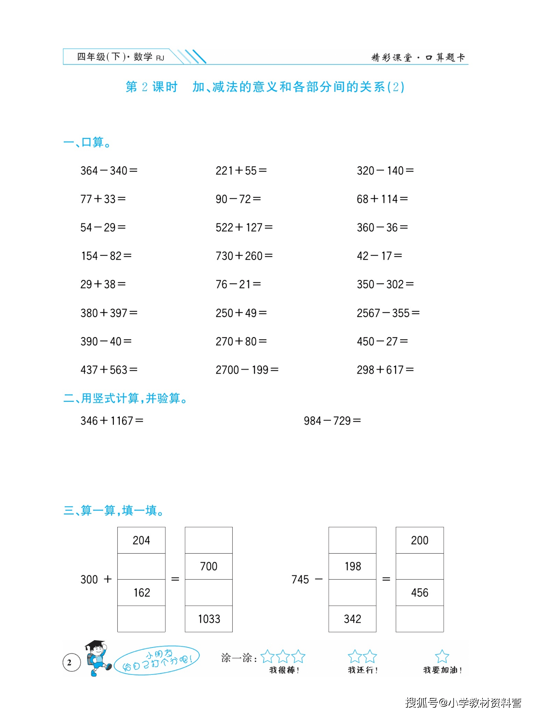 很多人觉得四则运算只是 “算得快”,其实不然。它更像一套严谨的思维框架:加法是 “合并”,减法是 “分解”,乘法是 “重复的加法”,除法是 “平均分”。理解这些本质,才能在面对复杂问题时不慌不忙。就像这本口算题卡里的练习,从基础口算到竖式验算,再到根据运算关系推导等式,每一步都在强化 “知其然,更知其所以然” 的能力。当我们能熟练写出 “756+374=1130” 的另外两个等式时,其实已经悄悄掌握了数学的可逆思维。
