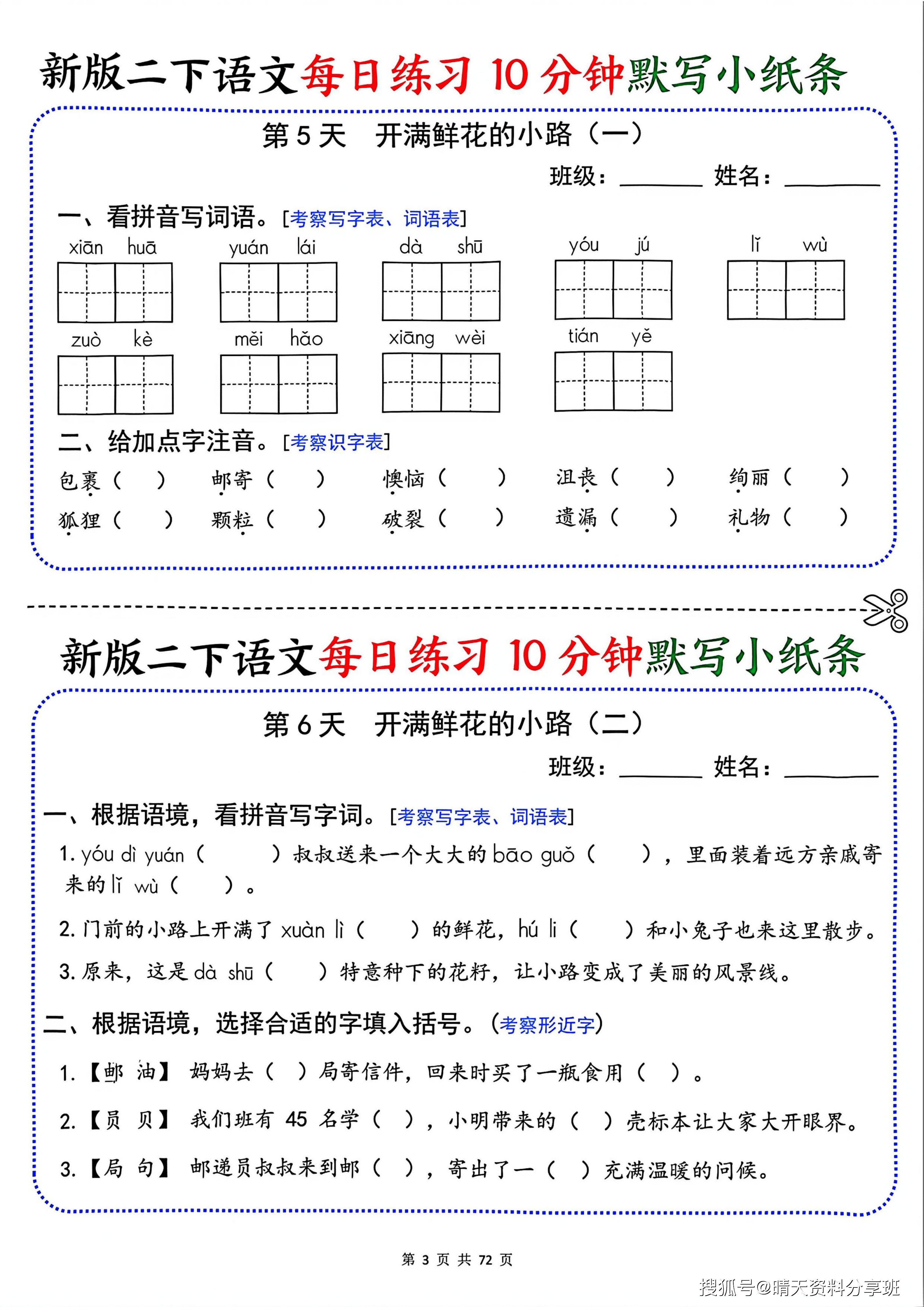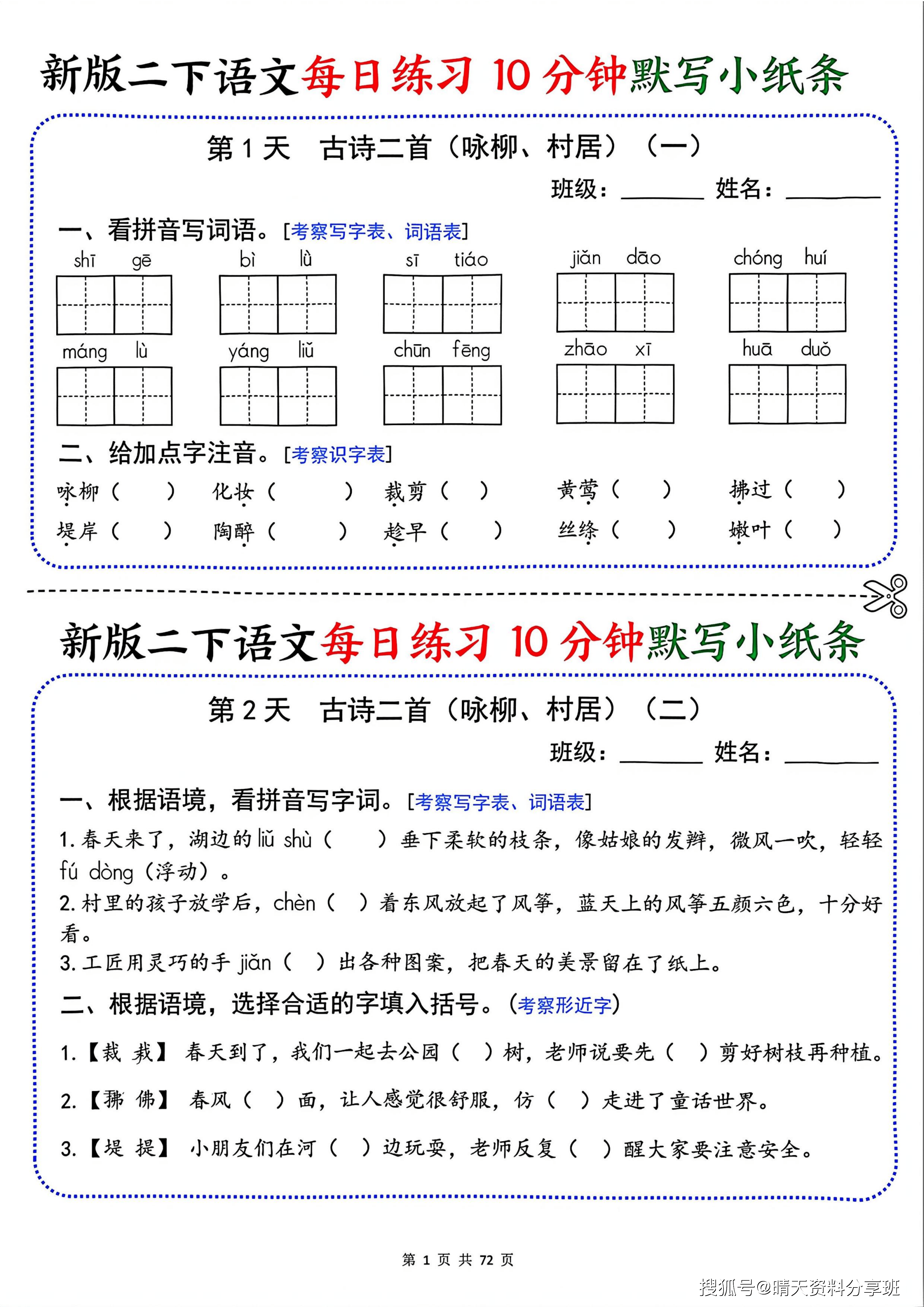 今天给大家分享:春日的晨光漫过书桌,一张小小的默写纸静静铺开。纸页上,“古诗二首” 的标题带着墨香,“看拼音写词语” 的空格像等待被唤醒的种子,“给加点字注音” 的括号里藏着对汉字的敬畏。这不是一张普通的练习纸,它是新版二年级下册语文的每日 10 分钟默写小纸条,是孩子们与文字相遇的日常,是语文学习里最朴素也最动人的仪式。