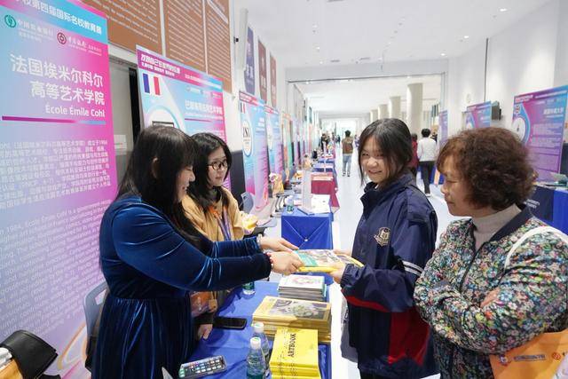 在法国埃米尔科尔高等艺术学院摊位前,一位初三男生向招生老师展示自己的动漫作品。他说:“我对艺术类院校比较感兴趣,想着在教育展上多了解、多看看。”