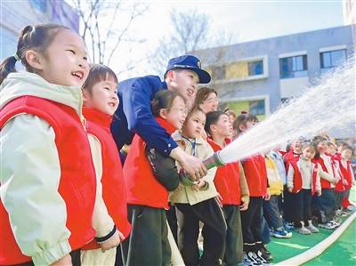日前,江苏省海安市第三实验幼儿园联合海安市消防救援大队,开展了消防安全主题教育活动。活动中,消防员变身“安全讲师”,逐一展示灭火器、消防水带等器材,孩子们争相试穿专业消防服,化身“小小消防员”,在体验中学习消防安全知识。图为孩子们体验消防水枪操作。曾敏 文 曹梅 摄