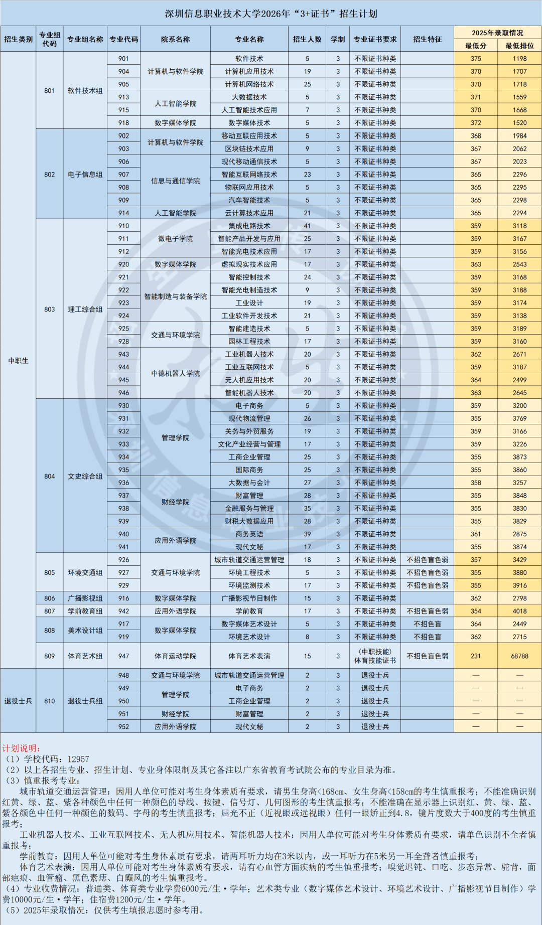 深圳信息职业技术大学2026年春季高考面向广东省专科批次安排招生计划