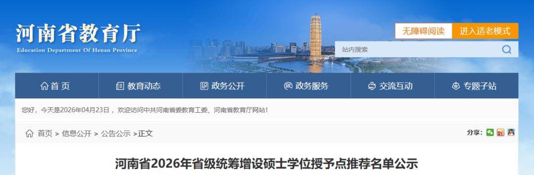 ■根据国务院学位委员会《博士硕士学位授予资格审核办法》和国务院学位委员会办公室《关于下达2026年度学位授予点动态调整省级统筹增设硕士学位授予点增量名额并做好相关工作的通知》要求,现将我省2026年度学位授予点动态调整省级统筹增设硕士学位授予点推荐名单予以公示。公示期为2026年4月23日至4月29日。