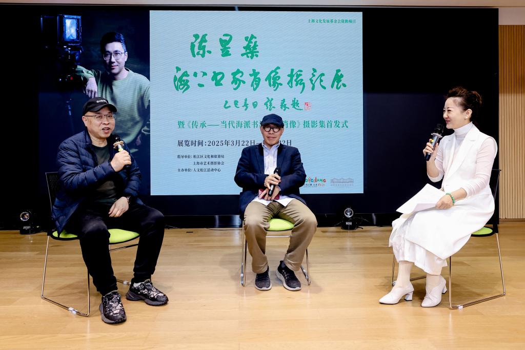 “海派书法与肖像摄影”跨媒介主题论坛,主持人施琰(右1),摄影评论家林路(左1)与作家、书法家管继平展开对谈
