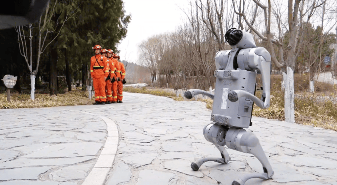 在北京舞彩浅山峪沟登山步道上,宇树机器狗同森林消防巡逻队员一起巡查山区林地。