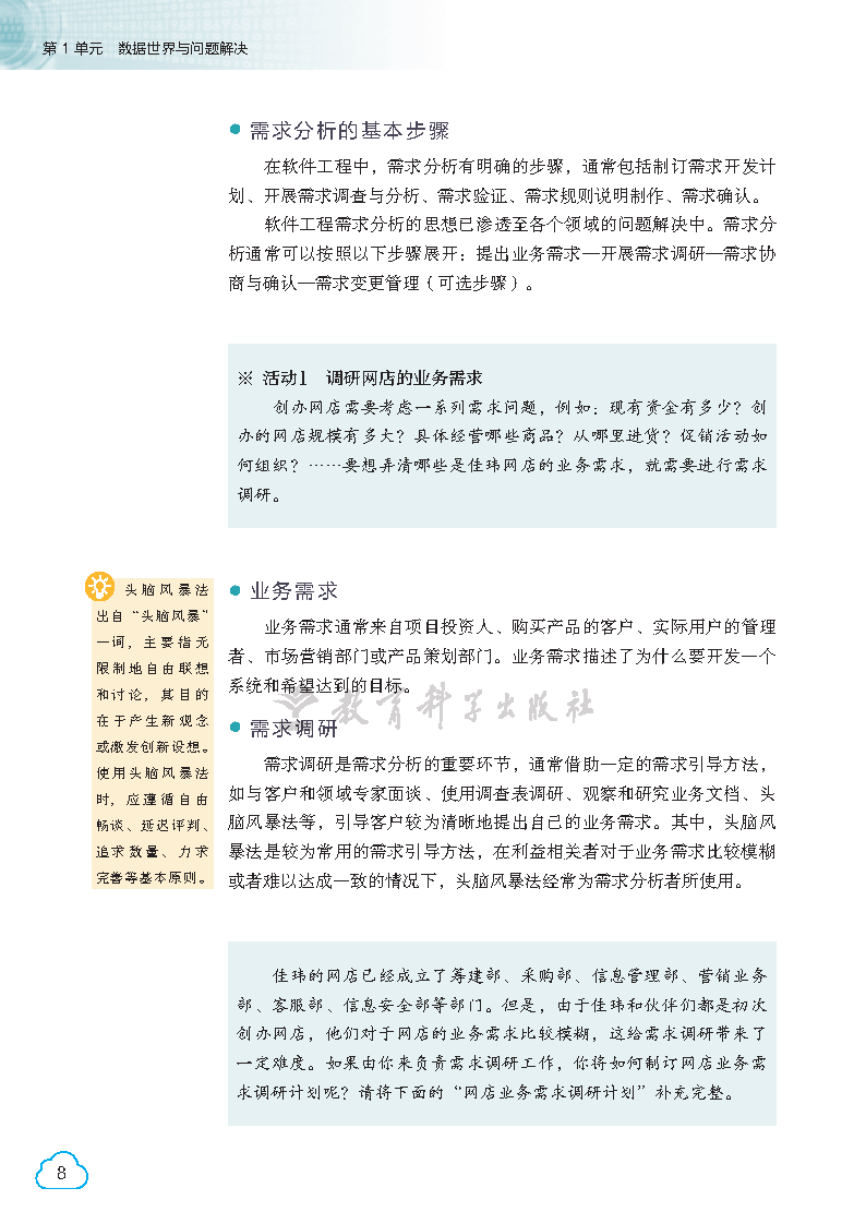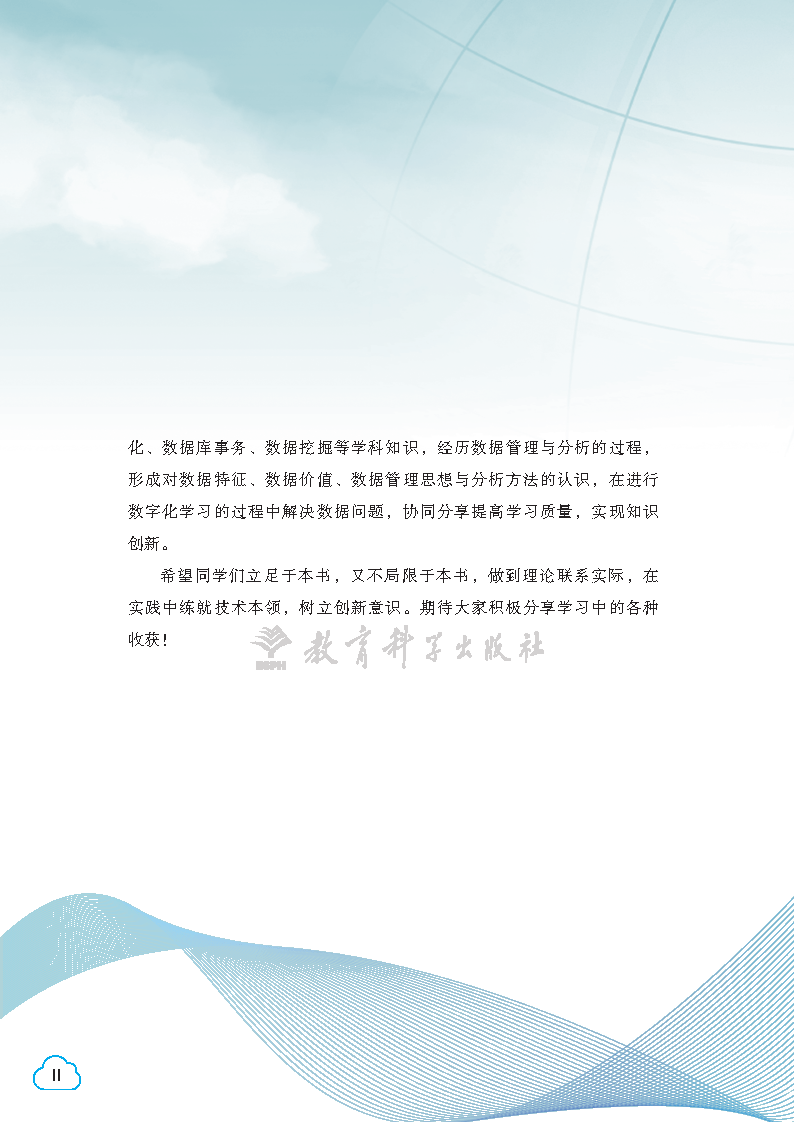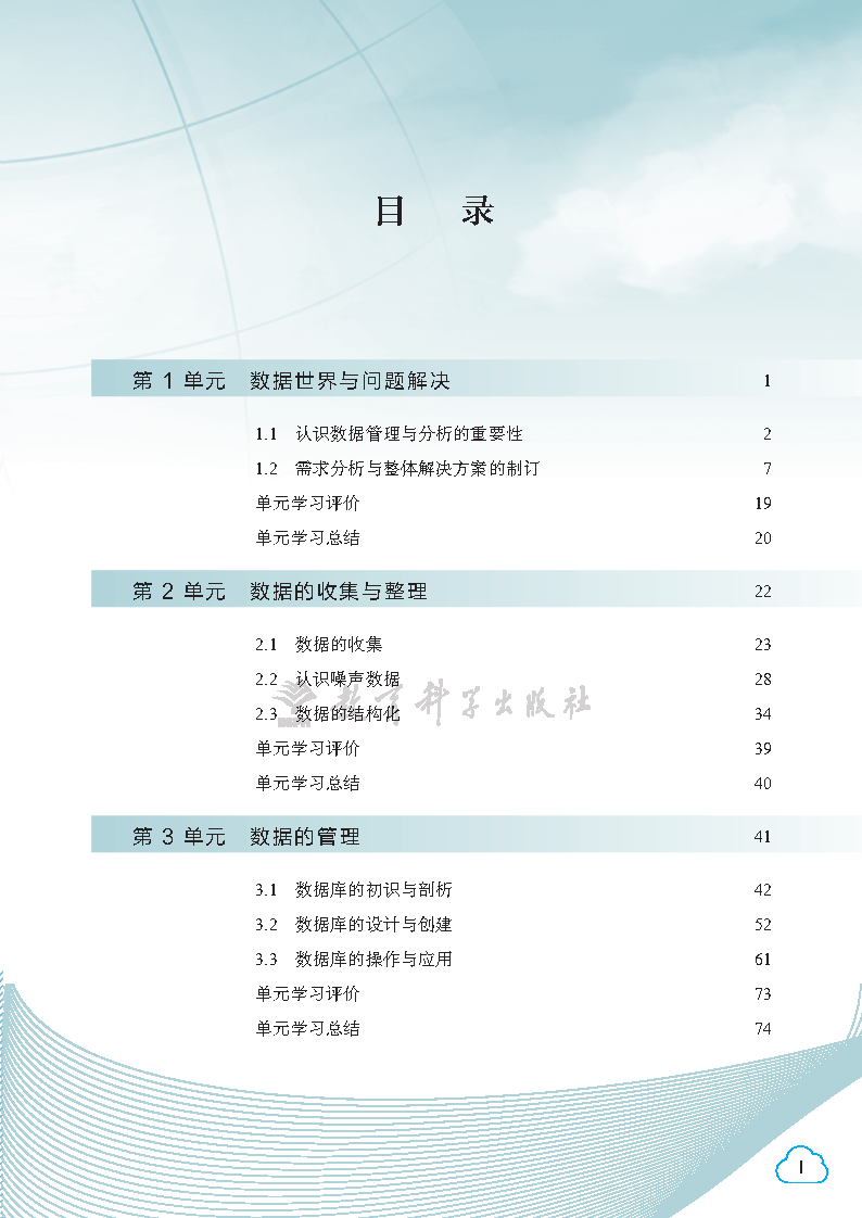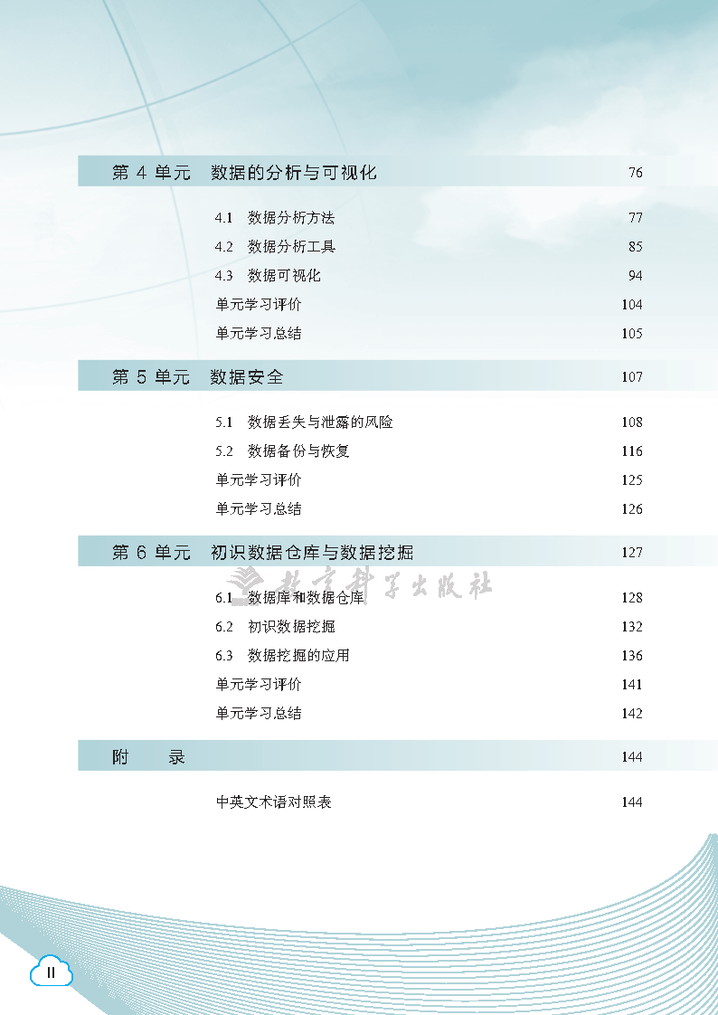 - **第二单元 数据管理**:通过“了解健身数据的采集与分类”项目认识数据的结构化,通过“建立简易网上书店数据库”项目了解关系数据库的建立。