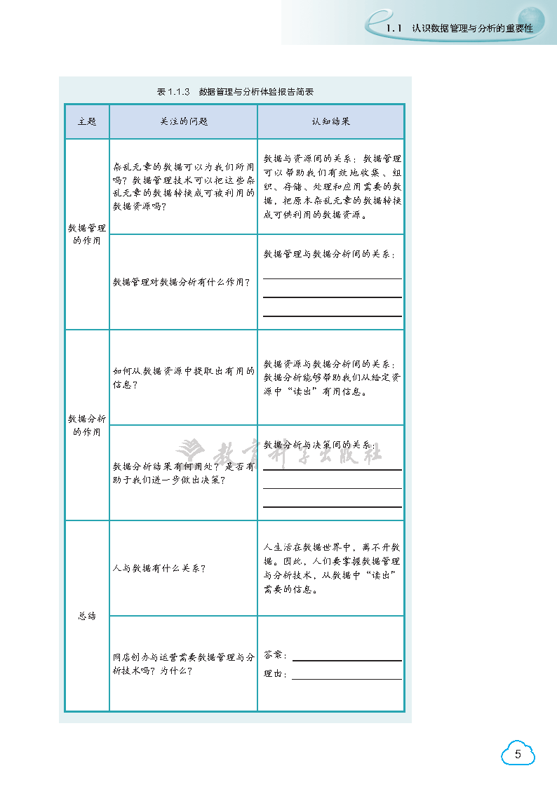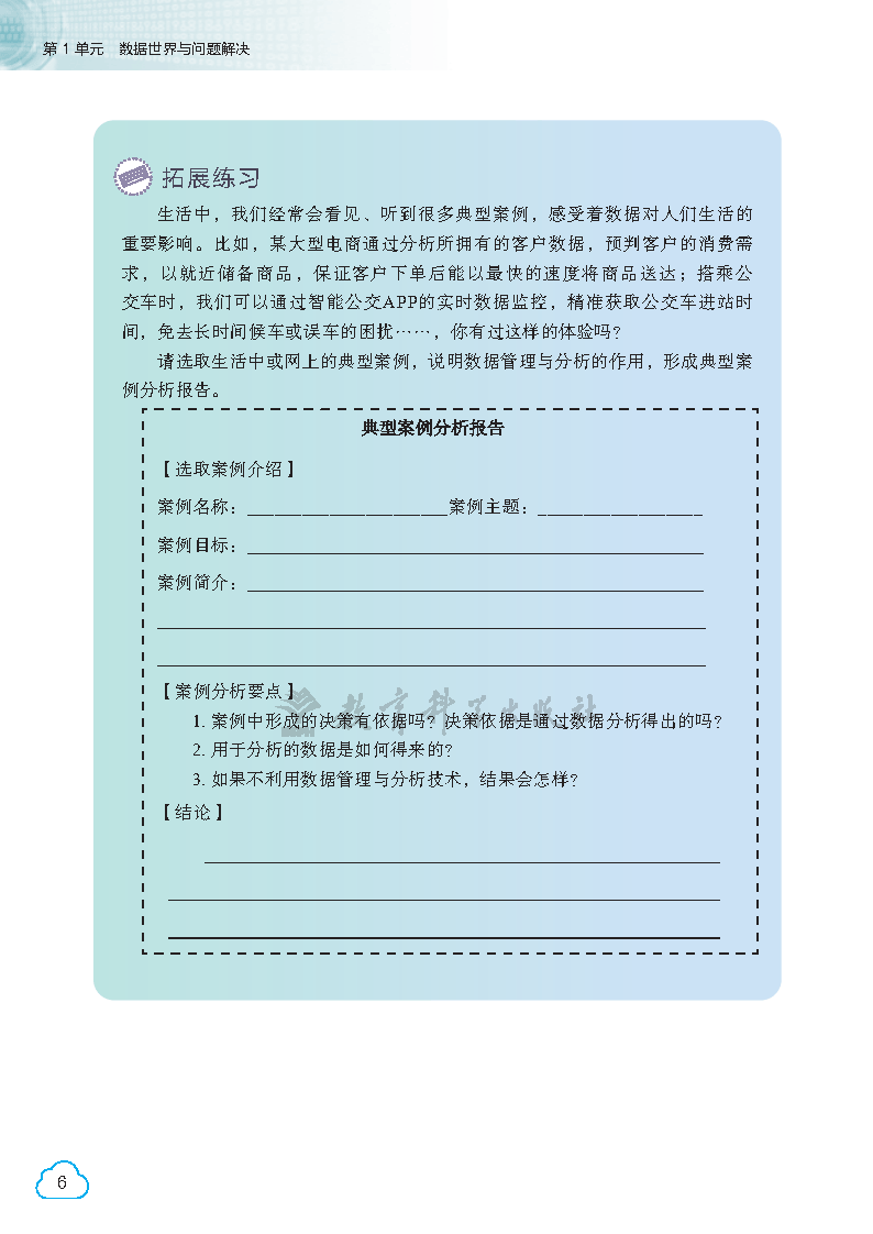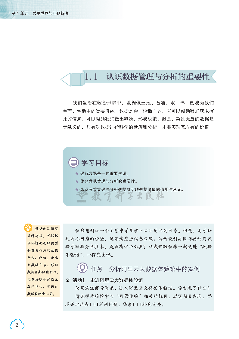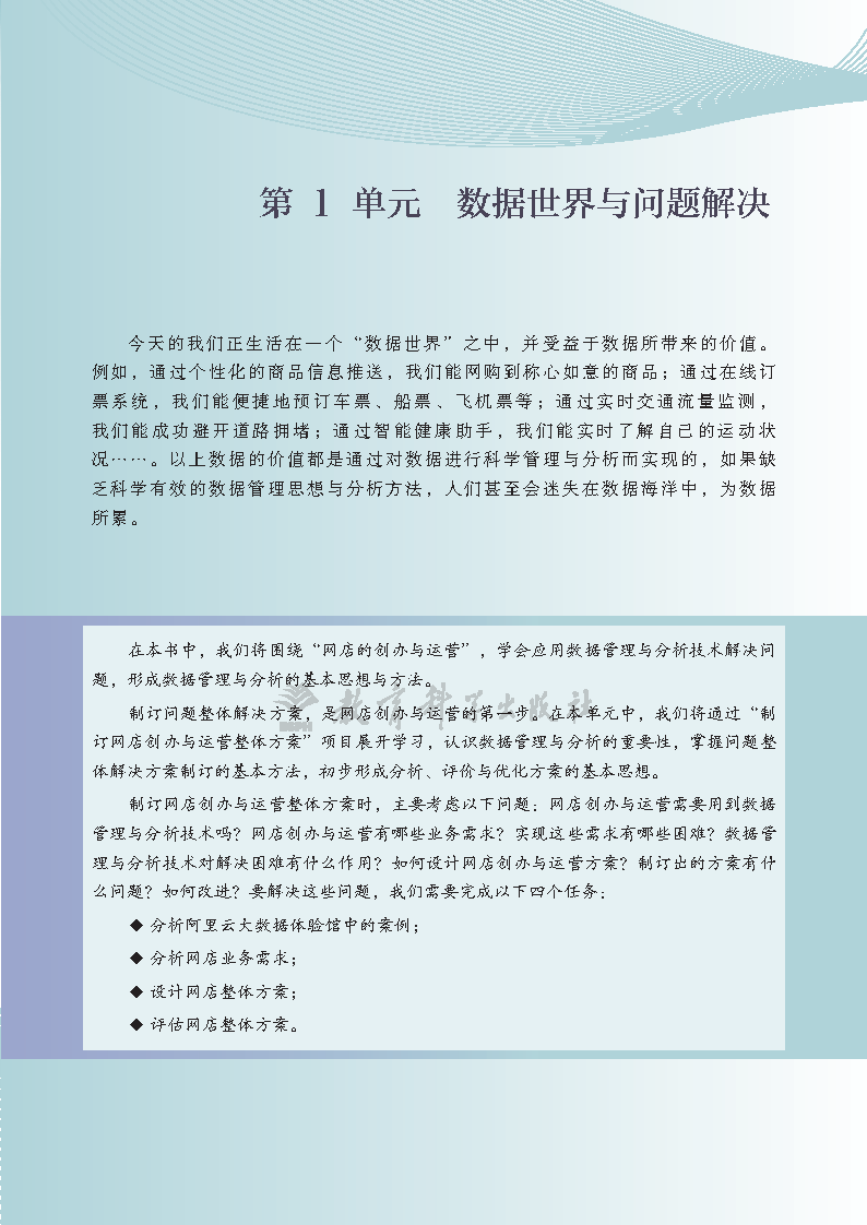 - **第一单元 初识数据管理与分析**:通过“探究交通数据的管理与分析”项目认识数据资源与价值,通过“了解网络购物数据的管理与分析”项目经历数据管理与分析的流程。