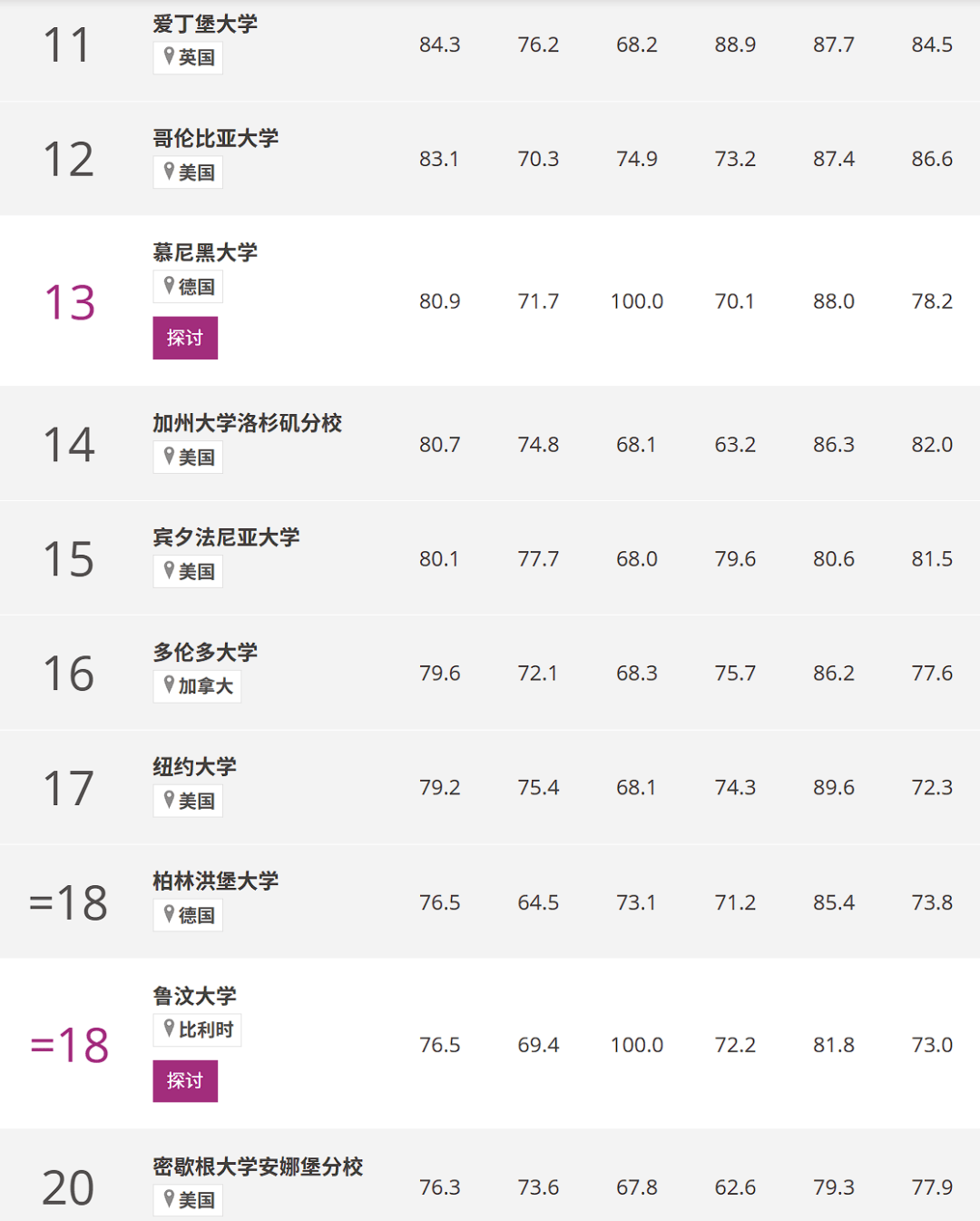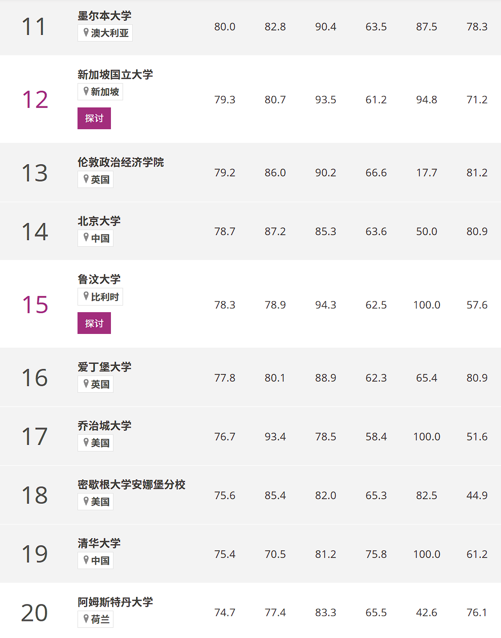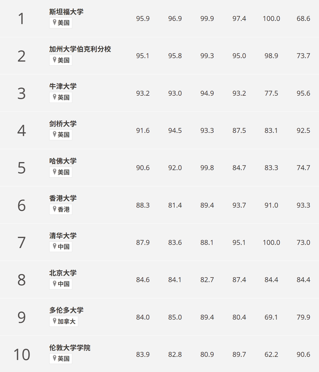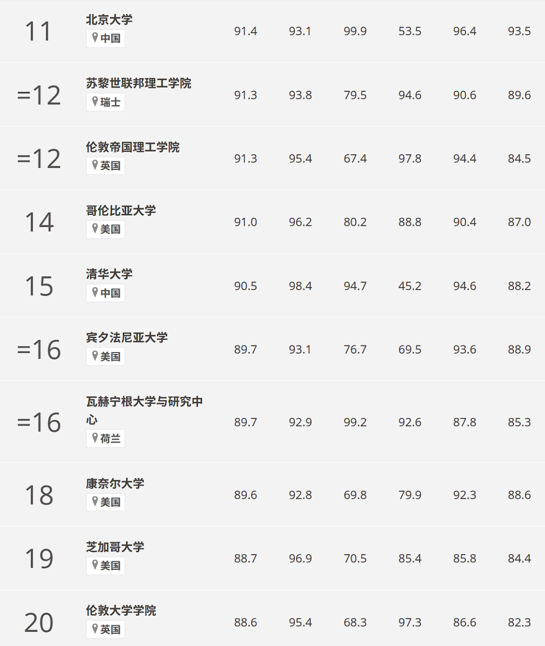 TOP 10完全被美国和英国包揽。TOP 20中,新加坡和荷兰各上榜一所,中国上榜两所,分别是北京大学 (第16名) ,新加坡国立大学 (第17名) ,阿姆斯特丹大学 (第18名) 和清华大学 (第20名)。