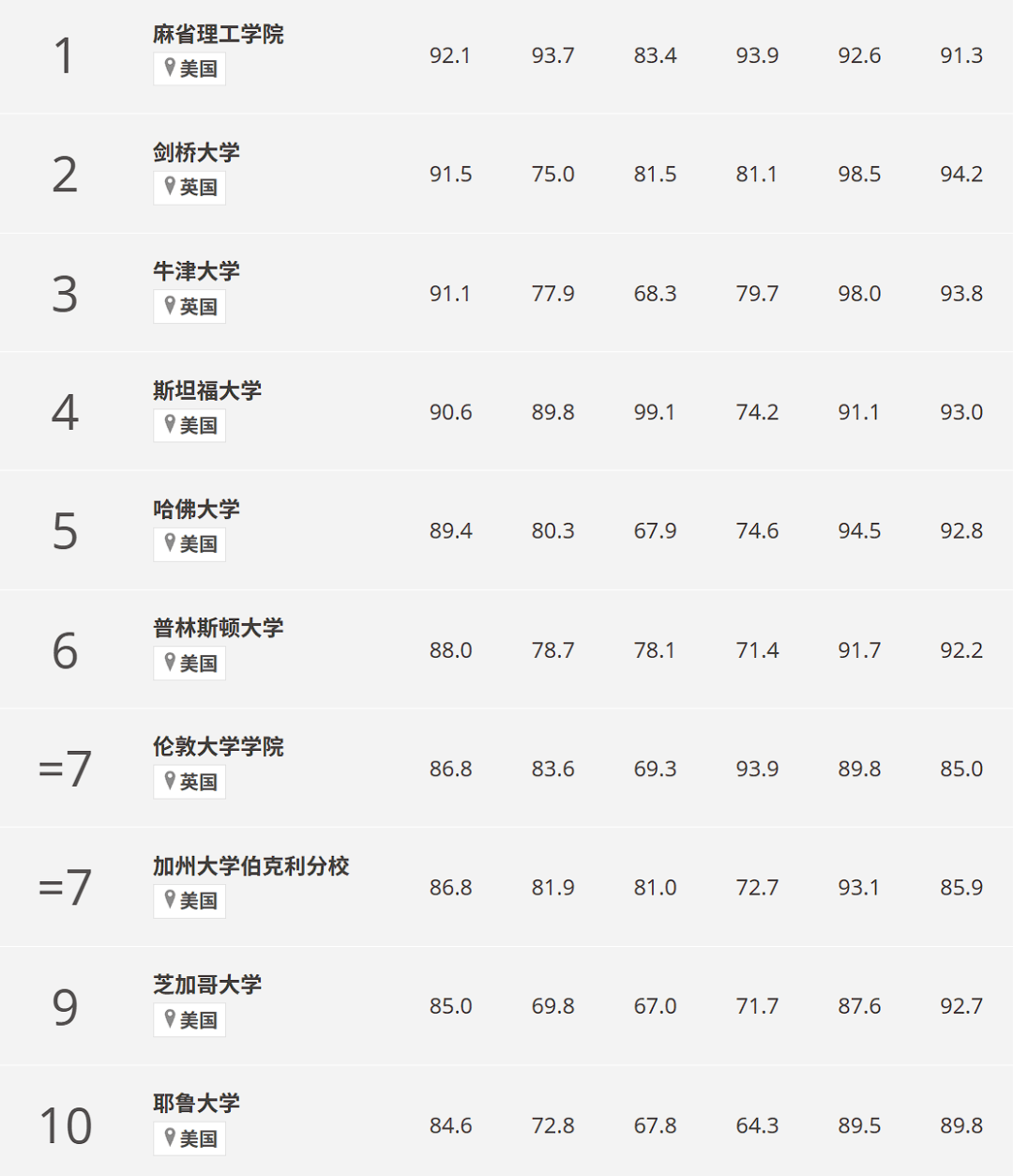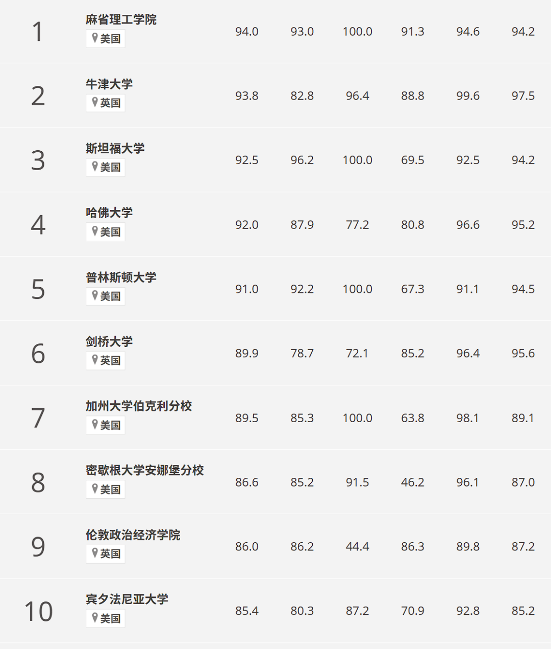 MIT依然稳居第一,牛津大学排名第二,斯坦福从第二掉到第三;
