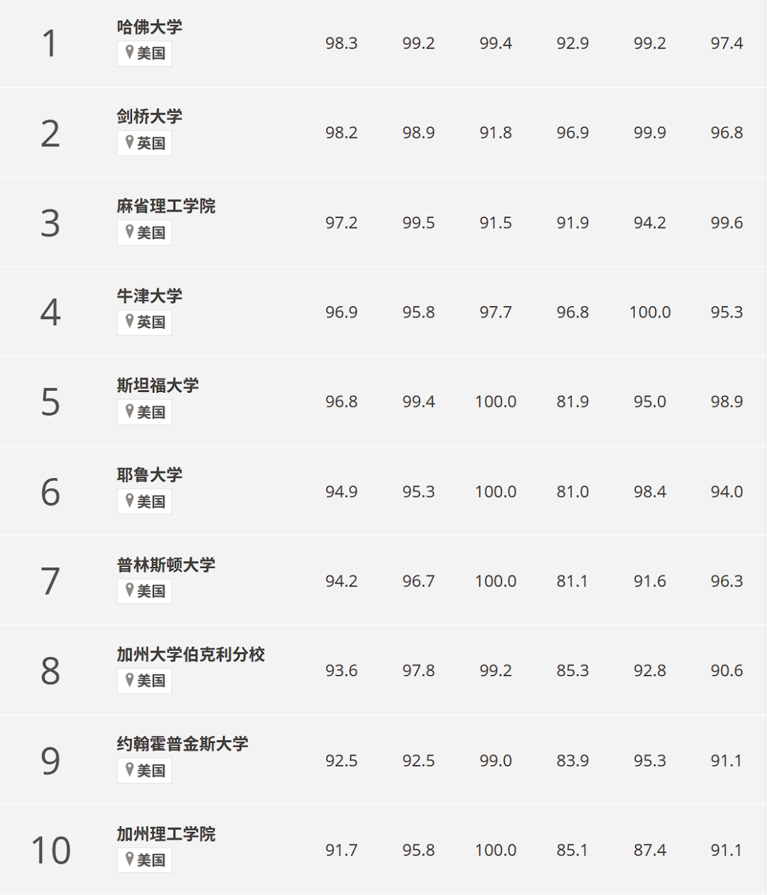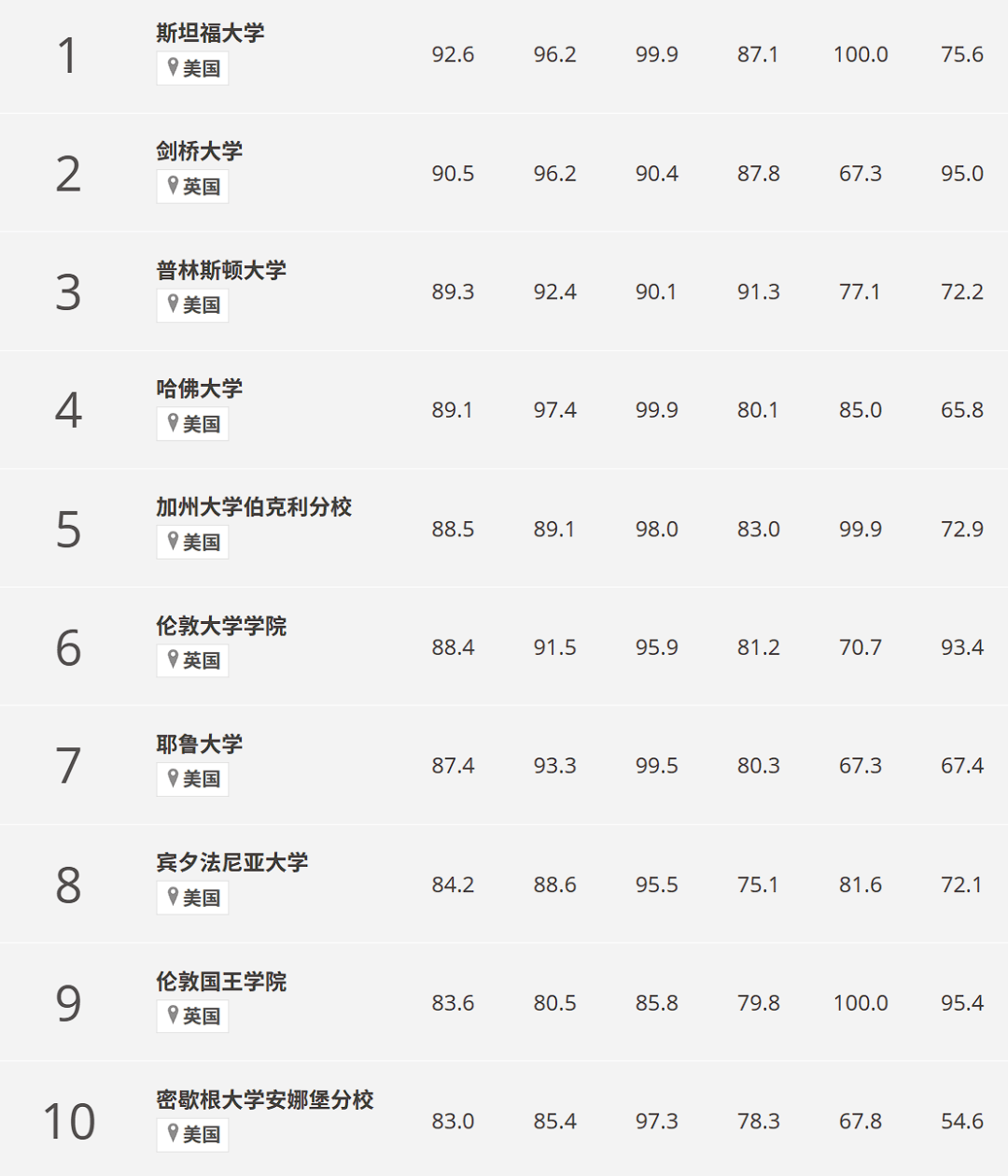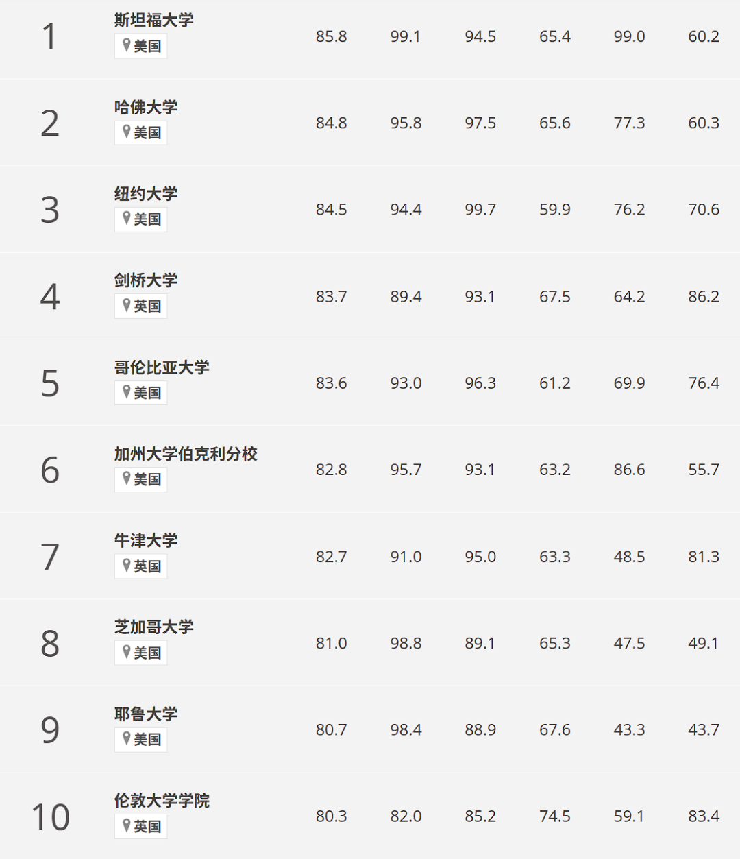 斯坦福从第一降至第四;哈佛大学没有变化,位列第五;