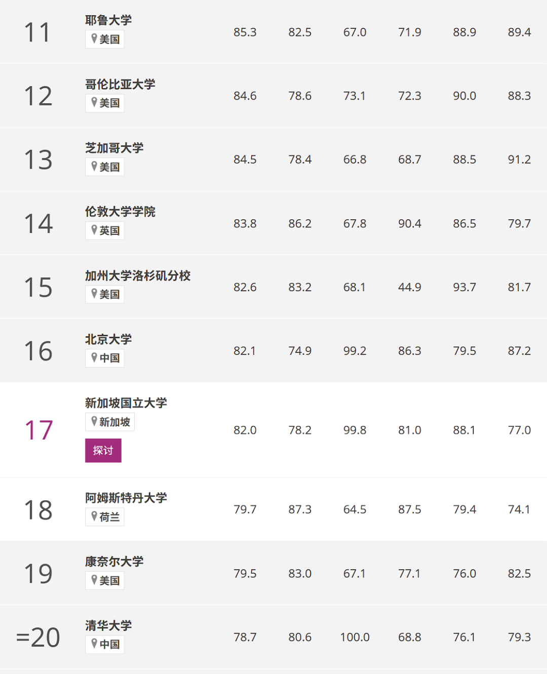新加坡国立大学进入top 10;耶鲁大学在短暂进入后又退出top 10。