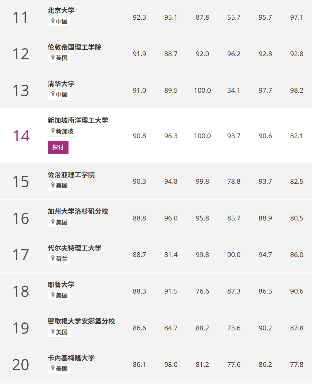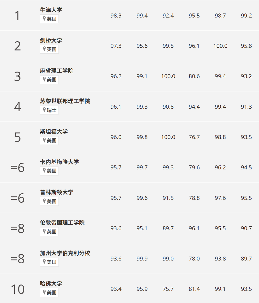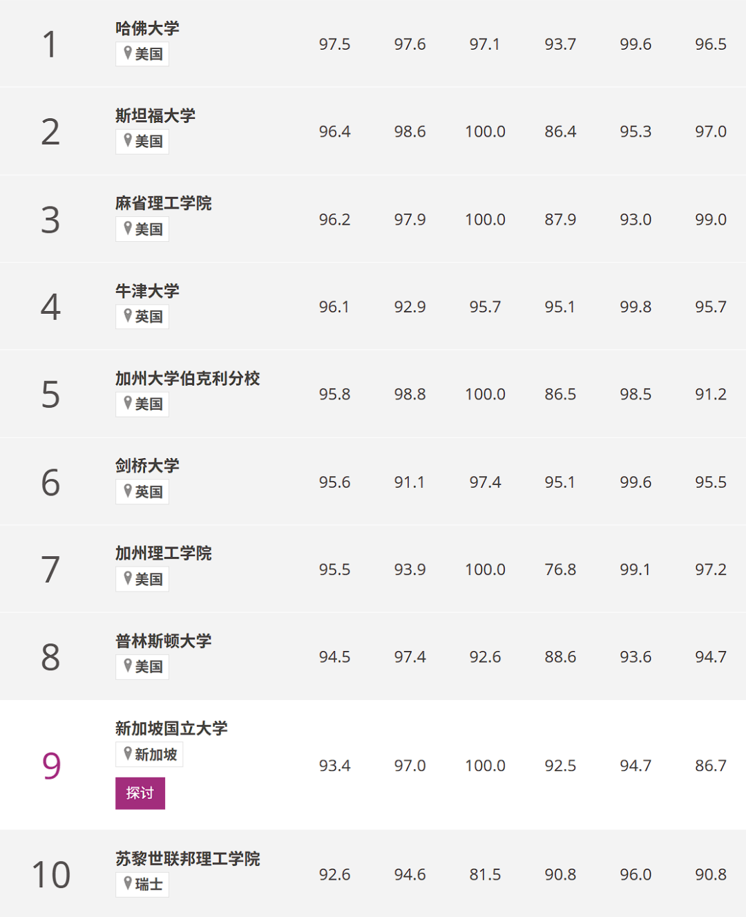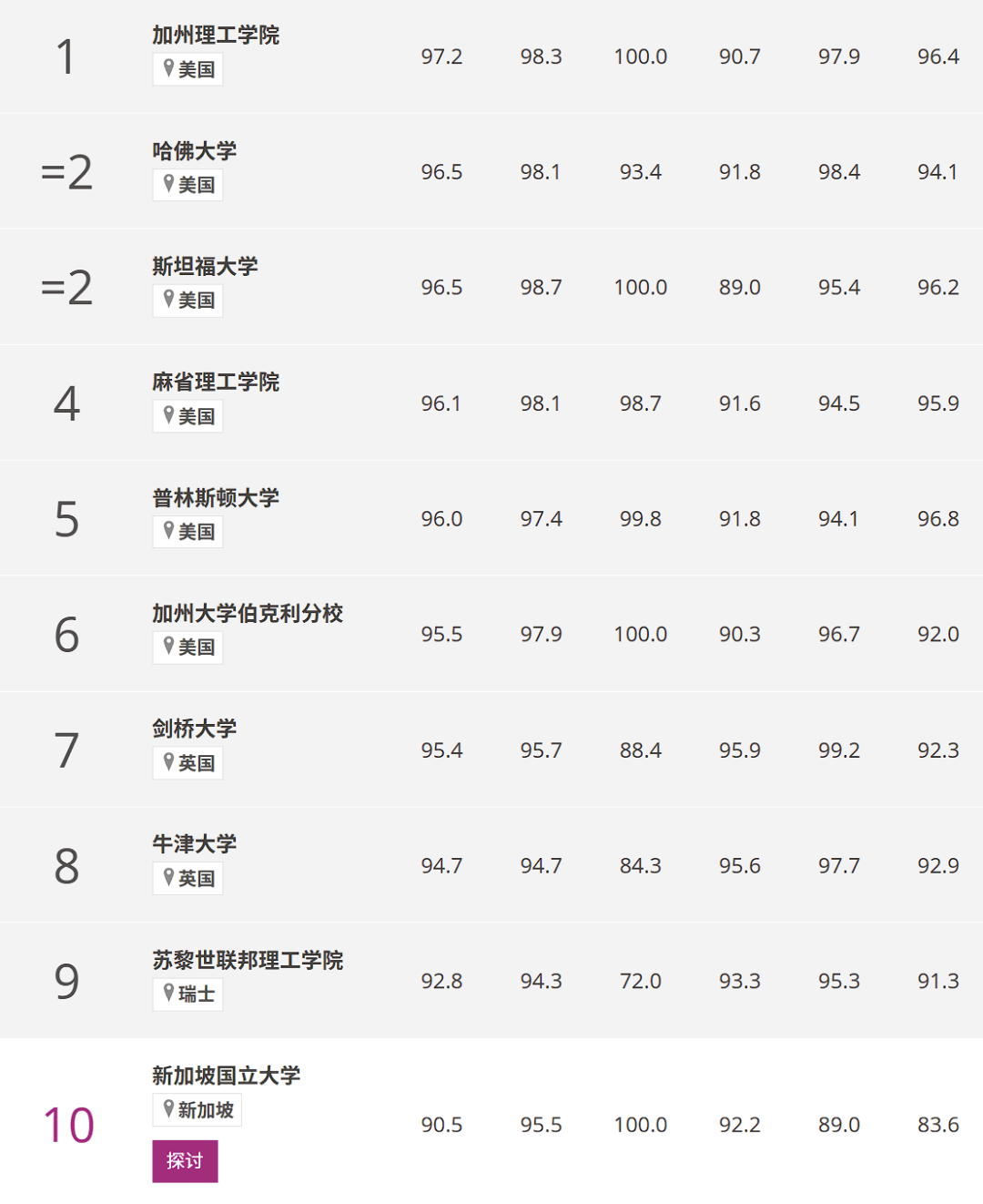 加州理工学院、普林斯顿和新加坡国立没有变化,位列七、八、九;苏黎世联邦理工学院重回第十;帝国理工学院掉出top 10。