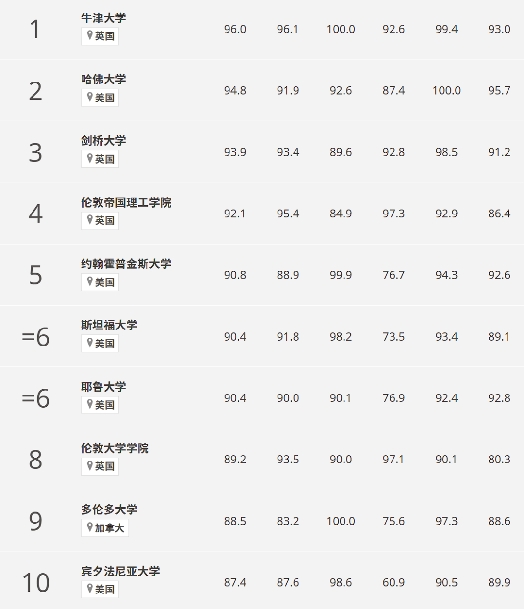 耶鲁大学、普林斯顿没有变化,位列六、七;加州大学伯克利分校和约翰斯霍普金斯大学互换位置,分列八、九;加州理工进入top 10;帝国理工学院退出TOP 10。