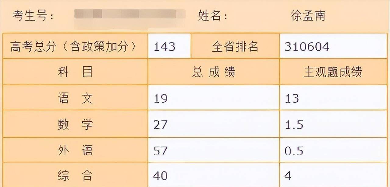 走出考场他一身轻松,面对家人的关心他一言不发,很快,成绩下来了,让他失望的是,他考得了143分,并不是心心念念的0分。