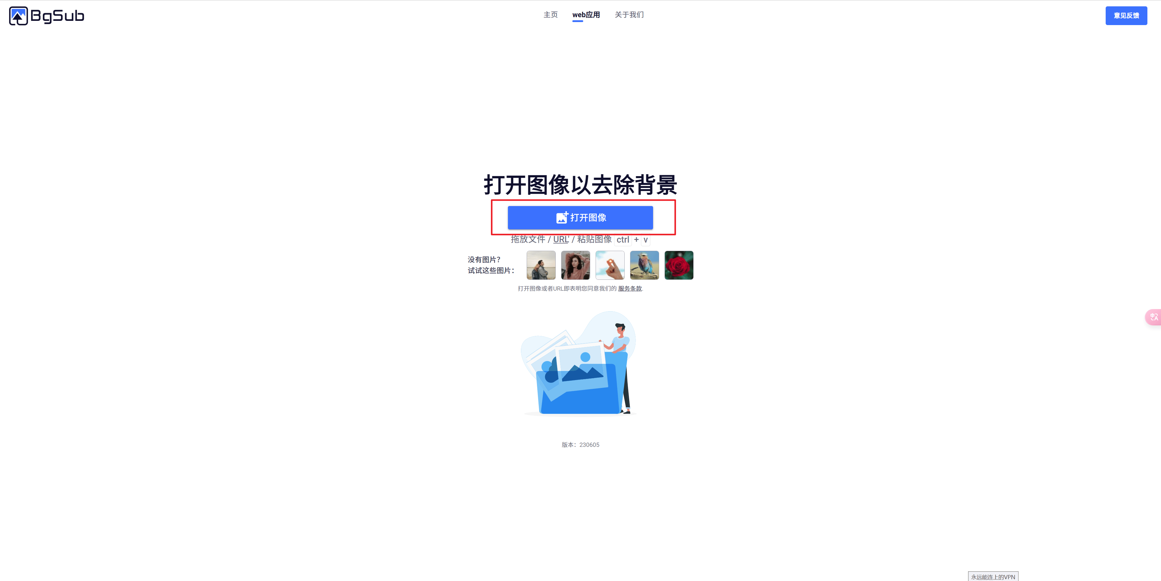 第一、来到 Bgsub 官网,在页面醒目处点击 Web 应用,之后就会进入到对应的抠图页面。